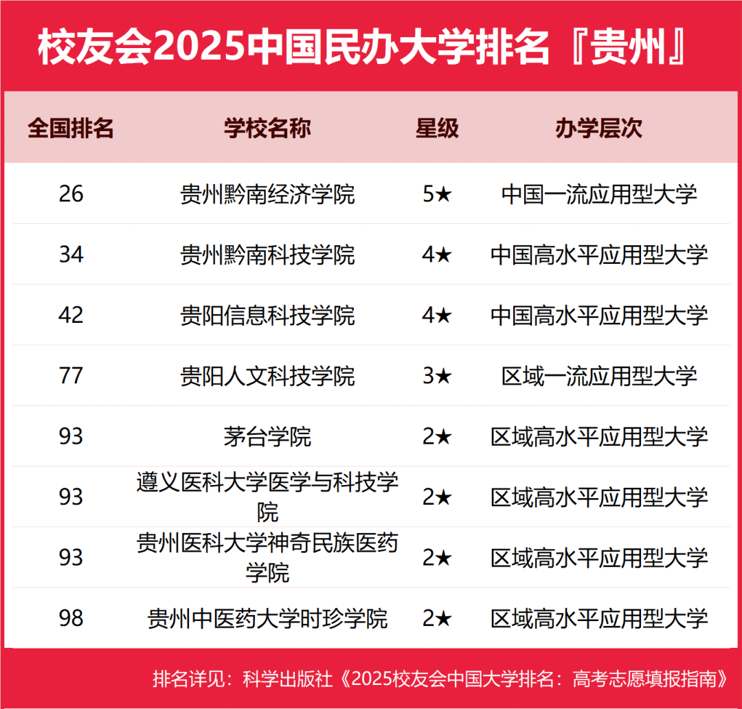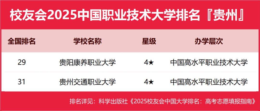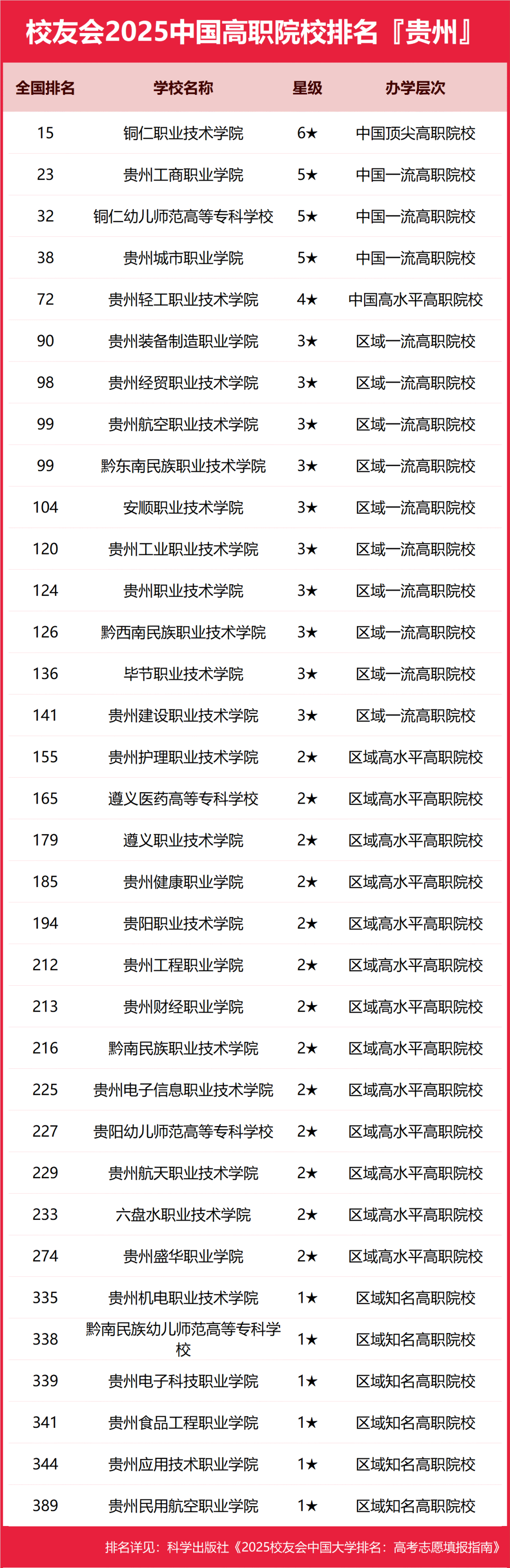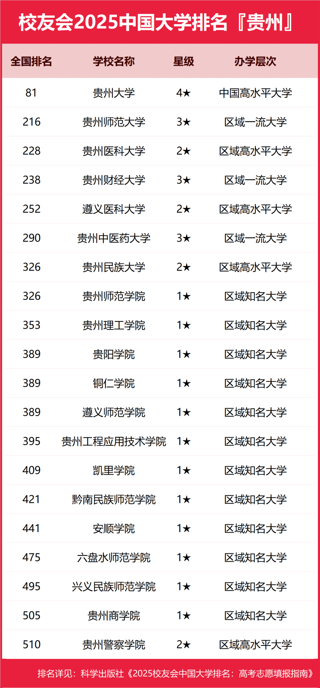 校友会2025贵州省大学排名,贵州大学第一,贵州医科大学第三榜单显示,在校友会2025贵州省大学排名中,贵州大学位居全国第81名,雄居校友会2025贵州省大学排名首位,贵州师范大学位居全国第216名,位居第2。贵州医科大学位居全国第228名,位居第3。贵州财经大学(第238)第4,遵义医科大学(第252)第5,贵州中医药大学(第290)第6,贵州民族大学(第326)第7,贵州师范学院(第326)第7,贵州理工学院(第353)第9,遵义师范学院(第389)第10,贵阳学院(第389)第10,铜仁学院(第389)第10。校友会2025贵州省民办大学排名,贵州黔南经济学院第一,贵阳信息科技学院前三在校友会2025贵州省民办大学排名中,贵州黔南经济学院位居全国第26名,雄居校友会2025贵州省民办大学排名首位,贵州黔南科技学院位居全国第34名,位居第2。贵阳信息科技学院位居全国第42名,位居第3。贵阳人文科技学院(第77)第4,遵义医科大学医学与科技学院(第93)第5,贵州医科大学神奇民族医药学院(第93)第5,茅台学院(第93)第5,贵州中医药大学时珍学院(第98)第8。校友会2025贵州省高职院校排名,铜仁职业技术学院第一,铜仁幼儿师范高等专科学校第二在校友会2025贵州省高职院校排名中,铜仁职业技术学院位居全国第15名,雄居校友会2025贵州省高职院校排名首位,贵州工商职业学院位居全国第23名,位居第2。铜仁幼儿师范高等专科学校位居全国第32名,位居第3。贵州城市职业学院(第38)第4,贵州轻工职业技术学院(第72)第5,贵州装备制造职业学院(第90)第6,贵州经贸职业技术学院(第98)第7,贵州航空职业技术学院(第99)第8,黔东南民族职业技术学院(第99)第8,安顺职业技术学院(第104)第10。校友会2025贵州省职业技术大学排名,贵阳康养职业大学第一,贵州交通职业大学第二贵州经济排名在校友会2025贵州省职业技术大学排名中,贵阳康养职业大学位居全国第29名,雄居校友会2025贵州省职业技术大学排名首位,贵州交通职业大学位居全国第31名,位居第2。