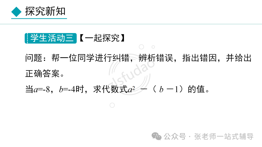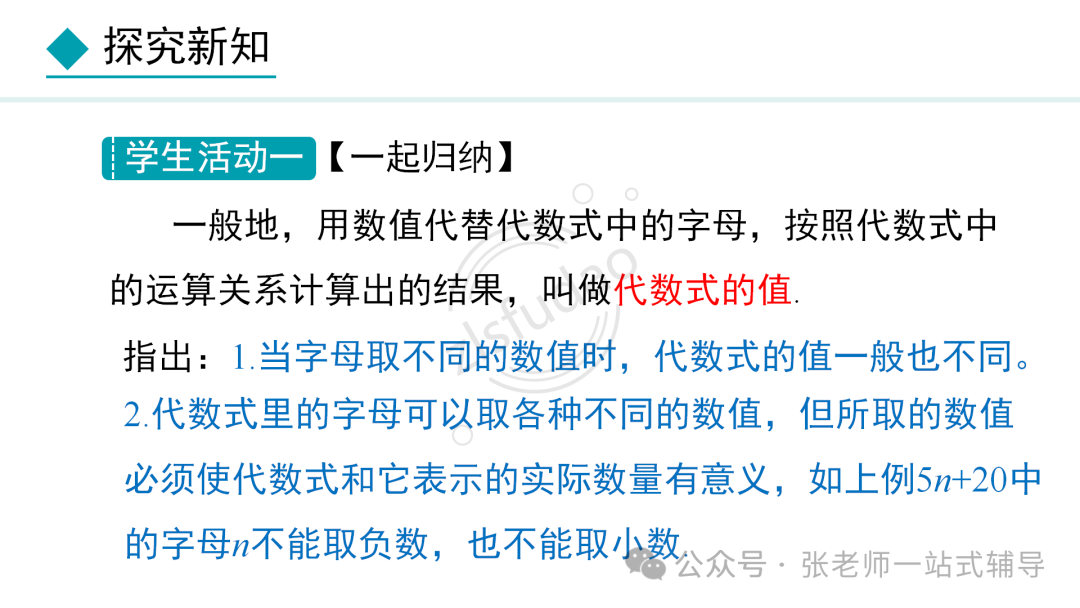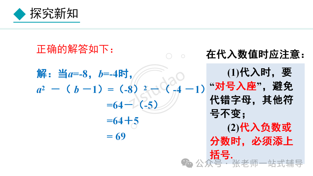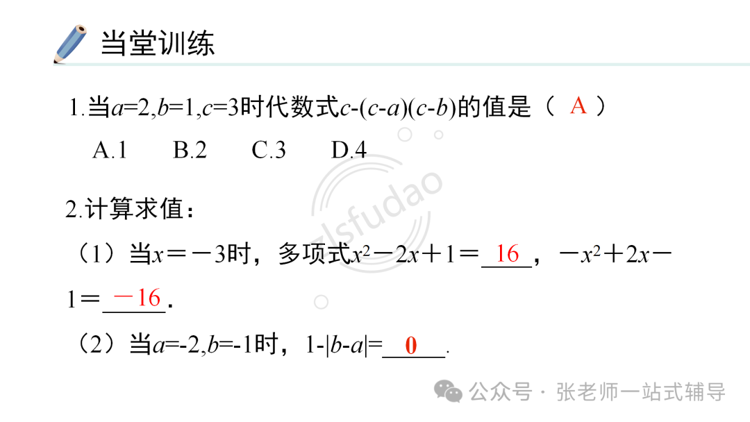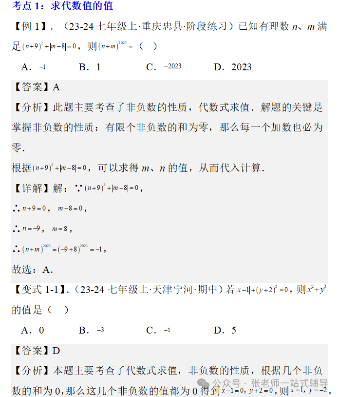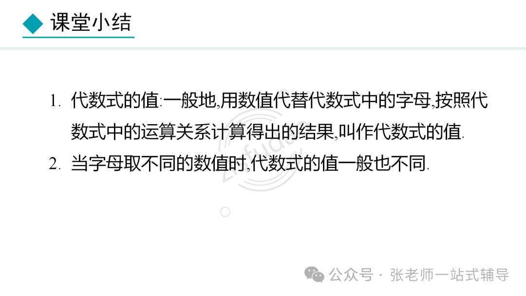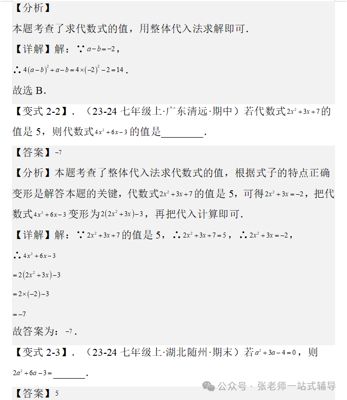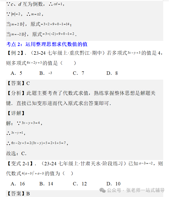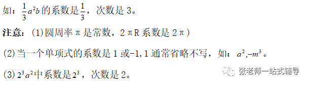 点击上方蓝字关注我们! 版本一 版本二 版本三 版本四 知识点1:单项式、多项式、整式的概念及它们的联系和区别 单项式:由数与字母的乘积组成的式子叫做单项式,单独一个数或一个字母也是单项式。 多项式:几个单项式的和叫多项式。 整式:单项式和多项式统称整式。 知识点2:单项式的系数和次数 单项式的系数是指单项式中的数字因数。单项式的次数是指单项式中所有字母的指数和。 知识点3 :多项式的项、常数项、次数 在多项式中,每个单项式叫做多项式的项。其中不含字母的项叫常数项。多项式中次数最高项的次数,就是这个多项式的次数。 注意:(1)多项式的每一项都包括它前面的符号。 (2)多项式的次数不是所有项的次数之和。 知识点4:同类项 同类项:所含字母相同,并且相同字母的指数也分别相等的项,另外所有的常数项都是同类项。 注意:同类项与系数大小无关,与字母的排列顺序无关。 知识点5:合并同类项法则 合并同类项法则:把同类项的系数相加,所得结果作为系数,字母和字母的指数保持不变。 知识点6:括号与添括号法则 去括号法则:括号前面是“+”号,把括号和它前面的“+”号去掉,括号里的各项都不变符号;括号前面是“-”号,把括号和它前面的“-”号去掉,括号里的各项都改变符号。 知识点7:升幂排列与降幂排列 为便于多项式的运算,可以用加法交换律将多项式各项的位置按某个字母的指数大小顺序重新排列。 若按某个字母的指数从大到小的顺序排列,叫做这个多项式按这个字母降幂排列。 若按某个字母的指数从小到大的顺序排列,叫做这个多项式按这个字母升幂排列。 注意:(1)重新排列后还是多项式的形式,各项的位置发生变化,其他都不变。 (2)各项移动时要连同它前面的符号。 (3)某项前的符号是“+”,在第一项位置时,正号“+”可省略,其他位置不能省,排列时注意添加或省略。 知识点8:整式加减的一般步骤 (1) 如果有括号,那么先去括号。有多重括号时,先小括号,再中括号,最后大括号。 (2) 如果有同类项,再合并同类项。 ●相关内容 1.1《正数和负数》讲解+练习 1.2.1《有理数的概念》讲解+练习 1.2.2《数轴》讲解+练习 1.2.3《相反数》讲解+练习 1.2.4《绝对值》讲解+练习 1.2.5《有理数的大小比较》讲解+练习 2.1.1《有理数的加法》讲解+练习 2.1.2《有理数的减法》讲解+练习 2.2.1《有理数的乘法》讲解+练习 2.2.2《有理数的除法》讲解+练习 2.3.1《乘方》讲解+练习 2.3.2《科学计数法》讲解+练习 2.3.3《近似数》讲解+练习 3.1.1《用字母表示数》讲解+练习 3.1.2《代数式与文字语言的相互转化》讲解+练习 3.1.3《用代数式表示数量与数量之间的关系》讲解+练习 ●其他内容 专题1有理数:知识点+中考真题 第二章《整式》复习:知识点+常考题 初中数学最易出错的61个知识点 ●其他内容 几何辅助线技巧(一)三角形辅助线(1) 几何辅助线精讲(一)三角形辅助线(2) 几何辅助线精讲(一)三角形辅助线(3) 几何辅助线精讲(二)特殊四边形辅助线(1) 几何辅助线精讲(二)特殊四边形辅助线(2) 几何辅助线精讲(二)特殊四边形辅助线(3) 备注:本资料电子教材来自百度网盘;视频讲解来自腾讯视频;知识点来自百度文库;图文素材来自七彩课堂;文字讲解及同步练习来自数学备课大师。![]()