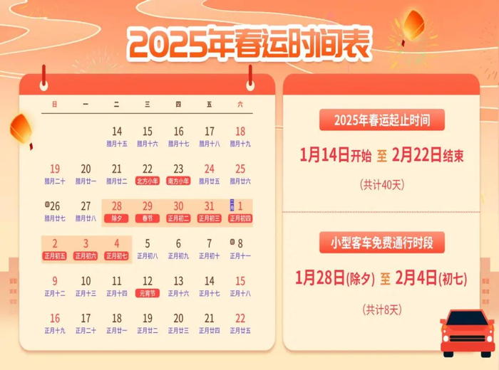 2025年春运将于1月14日开始,2月22日结束,共计40天。其中春节假期小型客车免费通行时段起止时间为1月28日(除夕)00:00至2月4日(正月初七)24:00,共计8天。