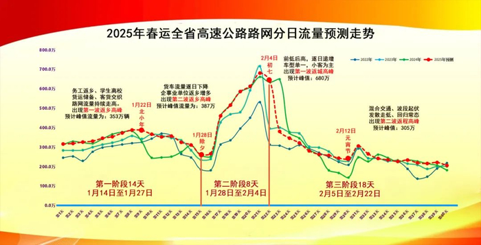 预计春节假期全省高速公路路网流量达4,022万辆,占春运总流量的29.7%。预测春运返程第一波车流高峰出现在2月3日至4日(初六至初七),其中2月3日(正月初六)达到返程最高峰,峰值流量为680万辆。此阶段是春运期间路网日均流量最大,小型客车占比最高阶段。
