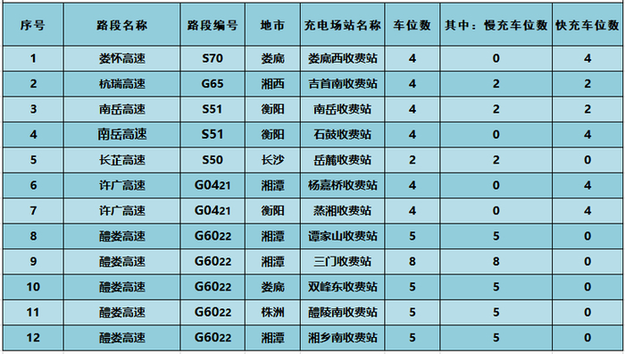 湖南省实现高速公路沿线充电基础设施全覆盖。截至目前,全省179.5对服务区(含停车区20对)共建成充电桩1084根,充电车位1975个,建成换电站39座,常备应急充电车13台。全省高速公路服务区充电车位全部为60kW以上的直流快充,其中罗桥、舂陵江、雷锋、湘阴南、永安、屈子祠等6对服务区(停车区)建成超级快充站,单枪功率最高可达600kw。另外,全省高速公路沿线收费站共建成充电站12座,充电车位54个。