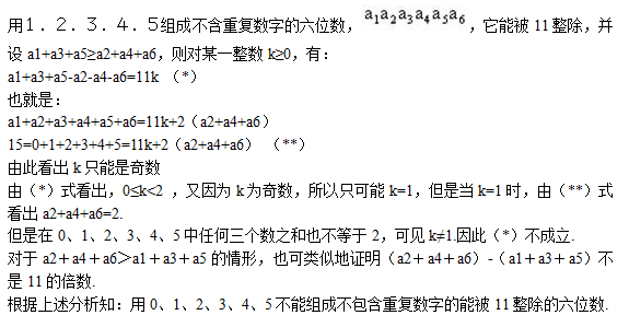 【题-011】计算:(中等难度)一个自然数,如果它的奇数位上各数字之和与偶数位上各数字之和的差是11的倍数,那么这个自然数是11的倍数,例如1001,因为1+0=0+1,所以它是11的倍数;又如1234,因为4+2-(3+1)=2不是11的倍数,所以1234不是11的倍数.问:用0、1、2、3、4、5这6个数字排成不含重复数字的六位数,其中有几个是11的倍数?