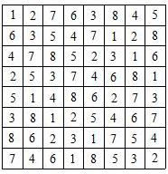 请在下图的每个空格内填入1至8中的一个数字,使每行、每列、每条对角线上8个数字都互不相同.
