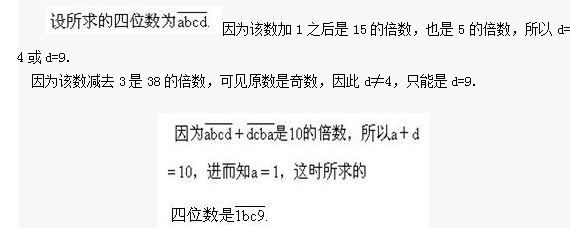 【题-013】四位数:(中等难度)某个四位数有如下特点:①这个数加1之后是15的倍数;②这个数减去3是38的倍数;③把这个数各数位上的数左右倒过来所得的数与原数之和能被10整除,求这个四位数.