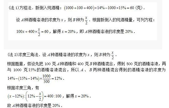 【题-007】浓度问题:(中等难度)瓶中装有浓度为15%的酒精溶液1000克,现在又分别倒入100克和400克的A、B两种酒精溶液,瓶中的浓度变成了14%.已知A种酒精溶液浓度是B种酒精溶液浓度的2倍,那么A种酒精溶液的浓度是百分之几?