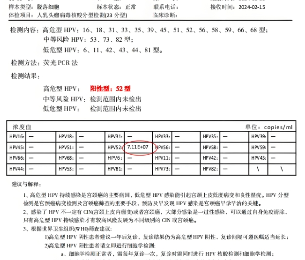 高危型HPV包括HPV16、18、31、33、35、39、45、51、52、56、58、59、68等型别,与宫颈癌及宫颈上皮内高度病变(CINⅡ/Ⅲ)的发生相关,尤其是HPV16和18型。图中结果为宫颈感染HPV52型高危病毒。