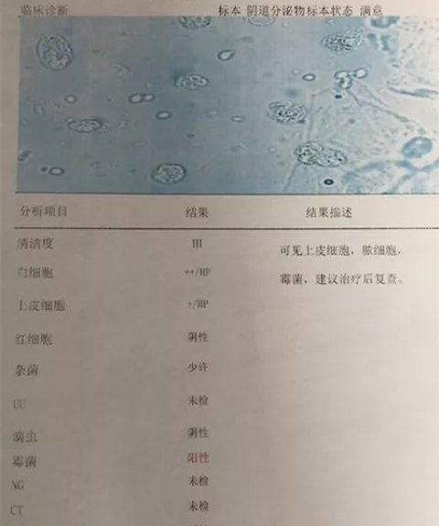 如图所示,这位检查者检查结果表明:阴道中检测到霉菌,而滴虫检查结果为“-”,说明存在霉菌性阴道炎!