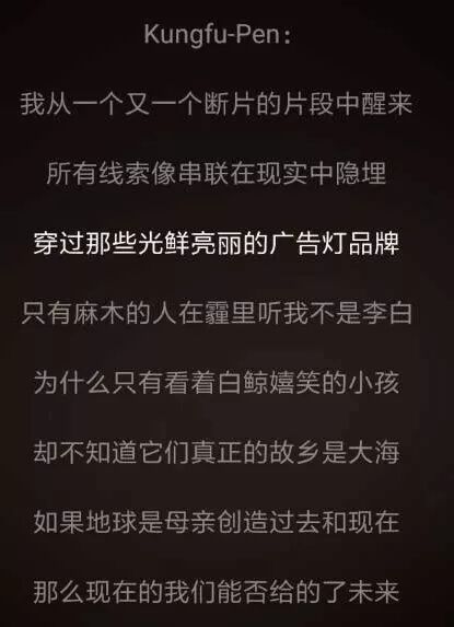 第一段是Kungfu-Pen的部分,如同众人皆醉我独醒的侠客,生于乱世之中,对这世界充满愤怒和疑问