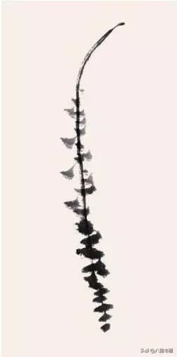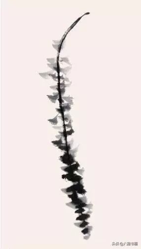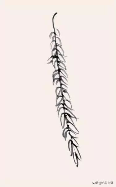 选小号狼毫笔,蘸取焦墨,留下自然飞白。采用没骨法运笔,画出柳枝,胡椒点方式点画叶子,侧锋运笔,点出近似三角形叶子,换取淡墨点画,完善柳条。