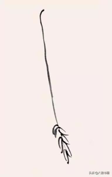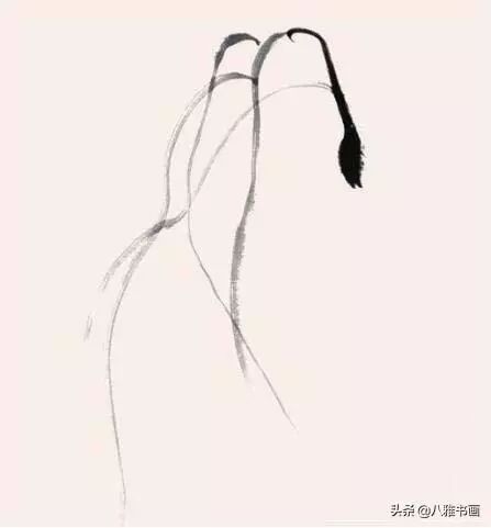 选小号狼毫笔,酿取浓墨,运笔流畅画出柳枝。双勾法中锋运笔,两笔画一扁叶。注意线条要灵活、协调。