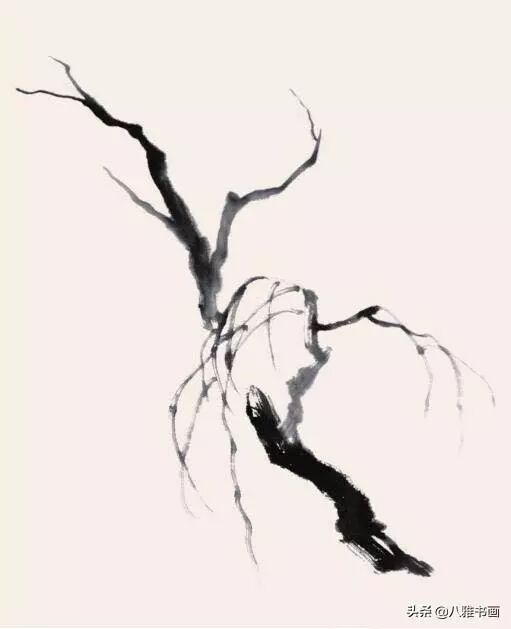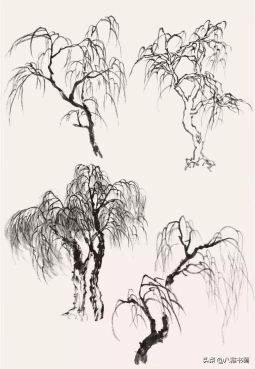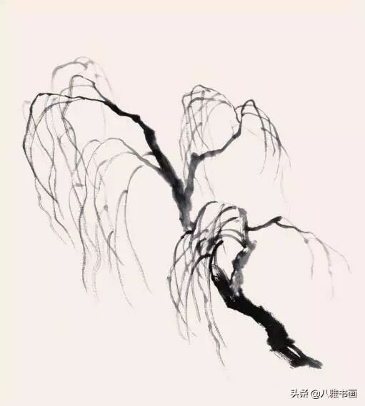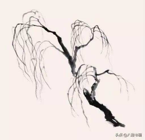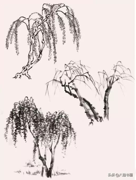 柳树体态妩媚,树干苍老,柳条柔软,树身纹路近于“人”字形。画柳条时要有粗细,笔缓势连,柔中带刚,蓬松富有变化。