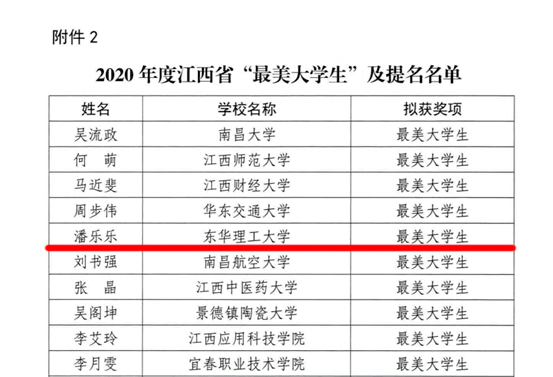 ?近日,中共江西省委宣传部、中共江西省委教育工委、江西省教育厅公布了2020年度江西省高校“最美辅导员”、“最美大学生”名单。其中,我校地球科学学院辅导员谢涛锋与文法学院学生潘乐乐双双上榜(全省各10名)。