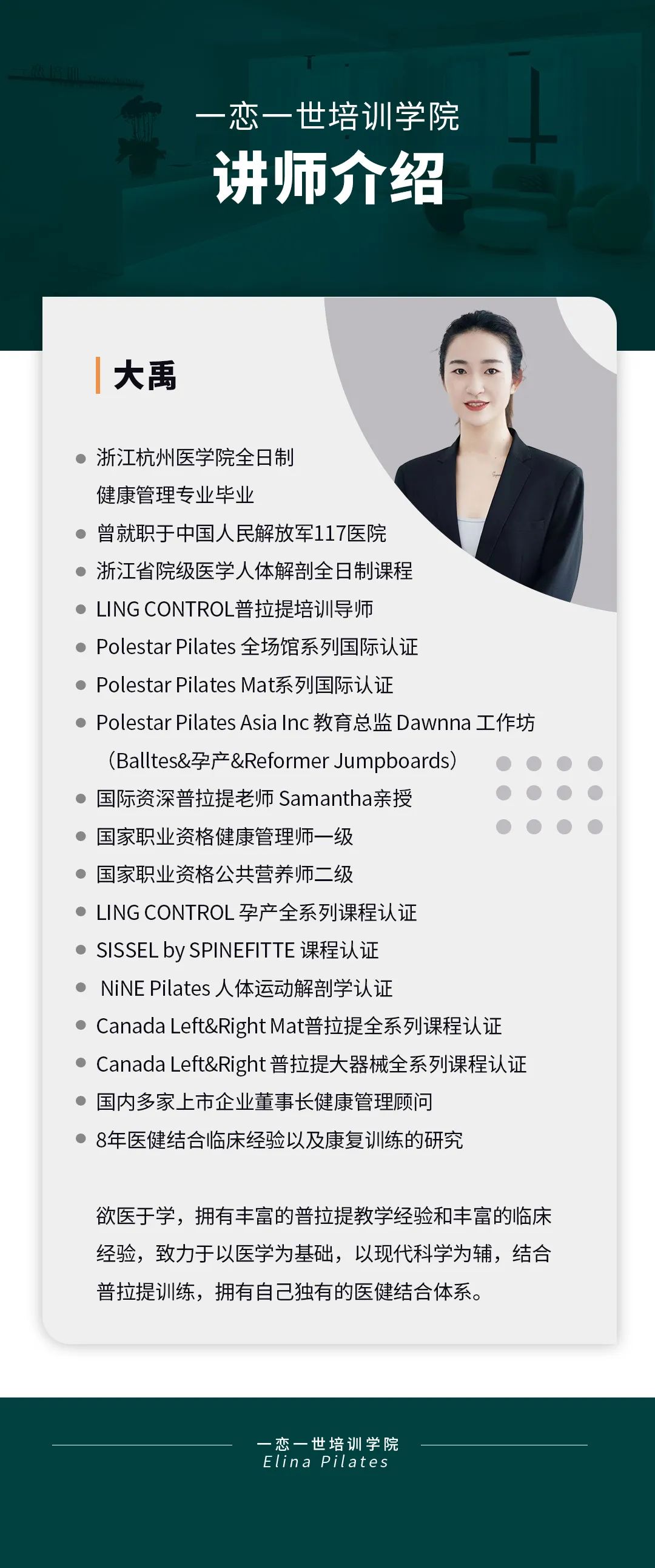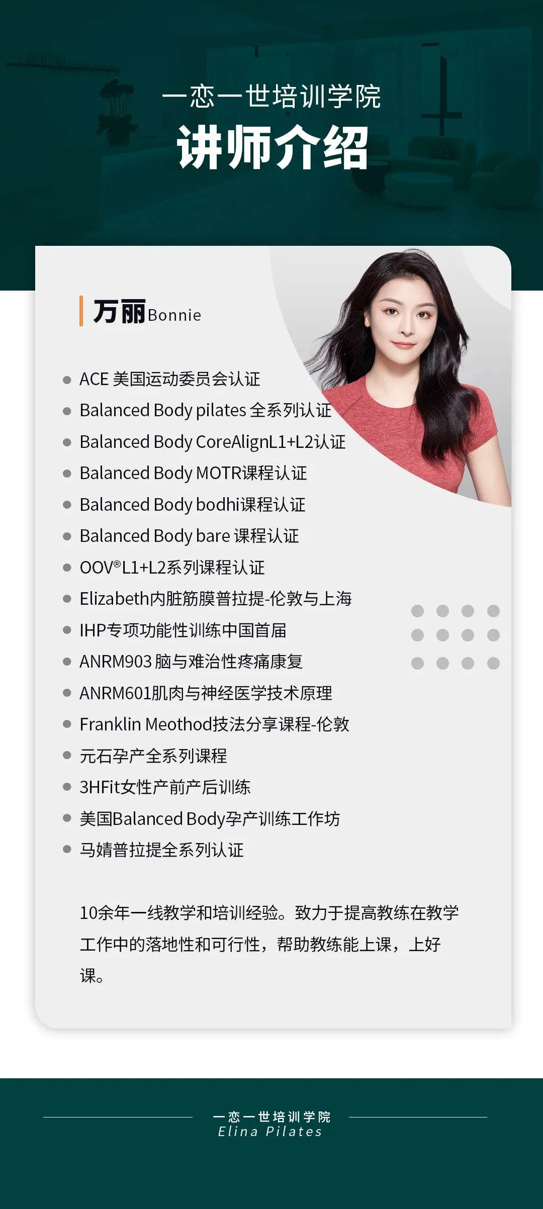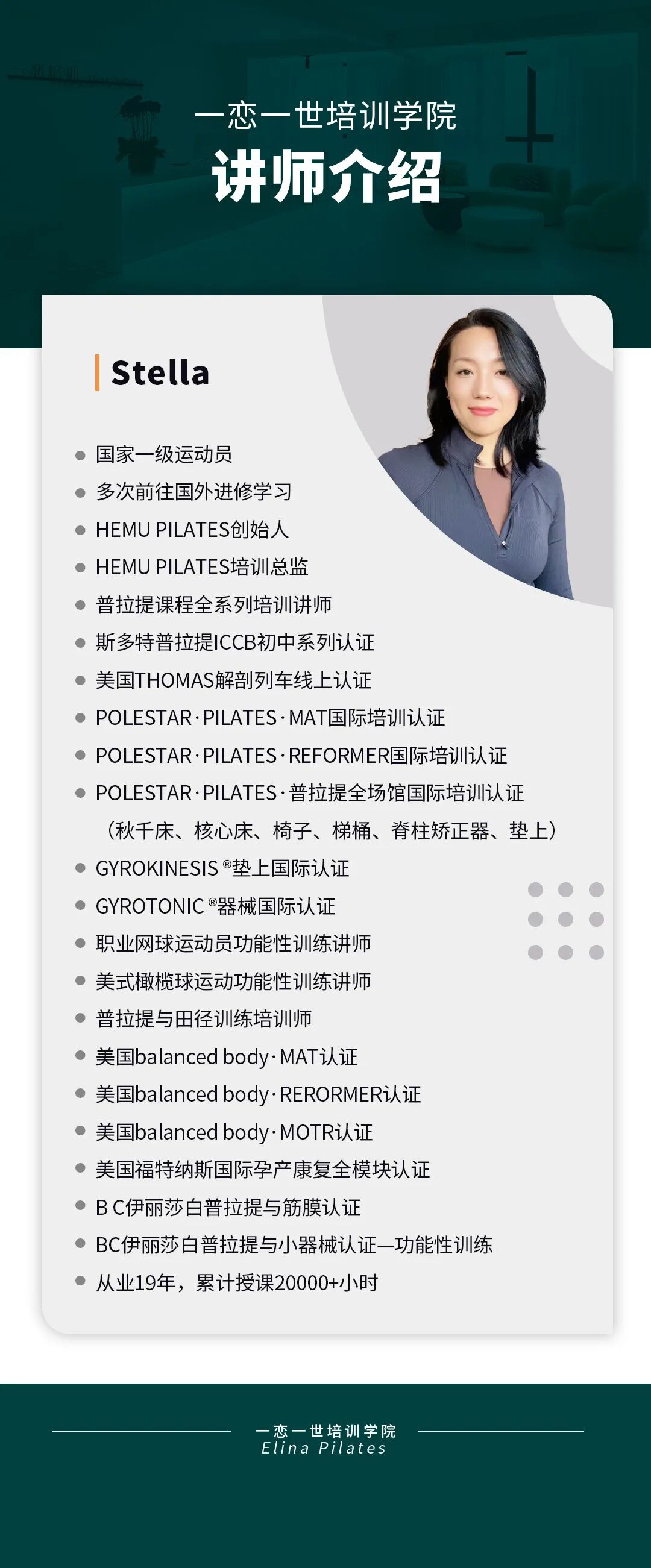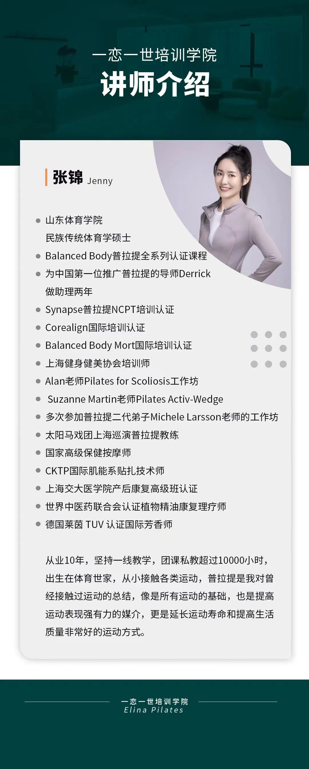 普拉提大器械 认识「一恋」 作为欧洲第一普拉提器械品牌,国际普拉提联盟PMA成员,以及全球首屈一指的普拉提器械生产和销售中心,一恋在业界享有崇高的地位。 一恋一世培训学院成立仅一个月,就吸引了600多名学员,每月培训近千人次,这些数字背后是学员对我们的信赖和支持。 五天四晚,会学到什么? ELINA 课程概要 SYLLABUS DESIGNING