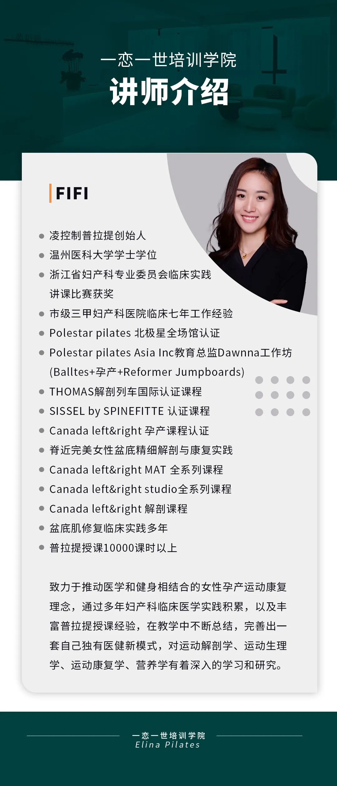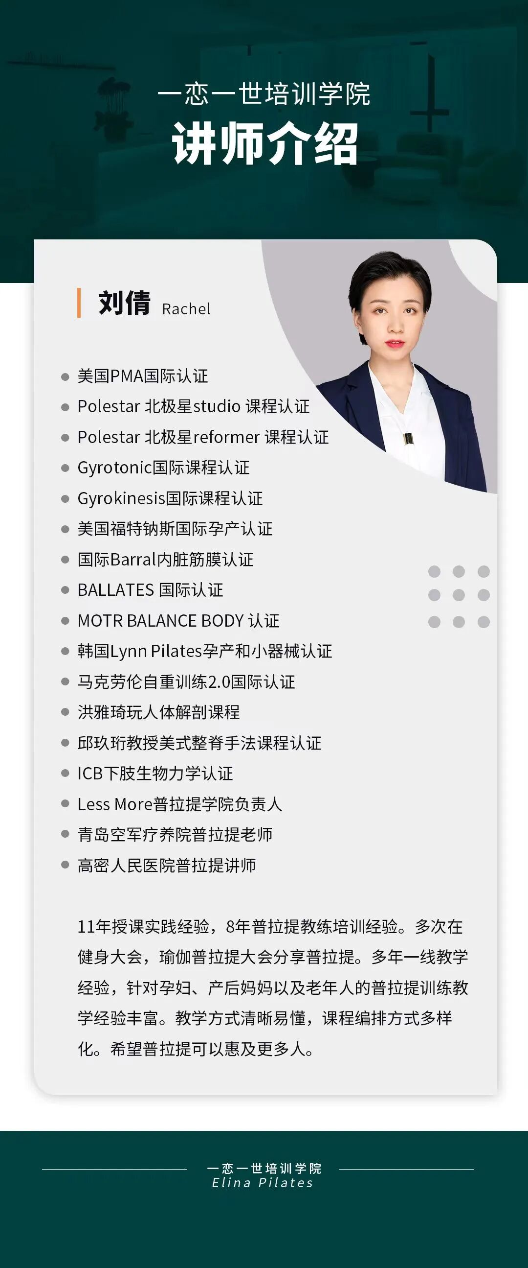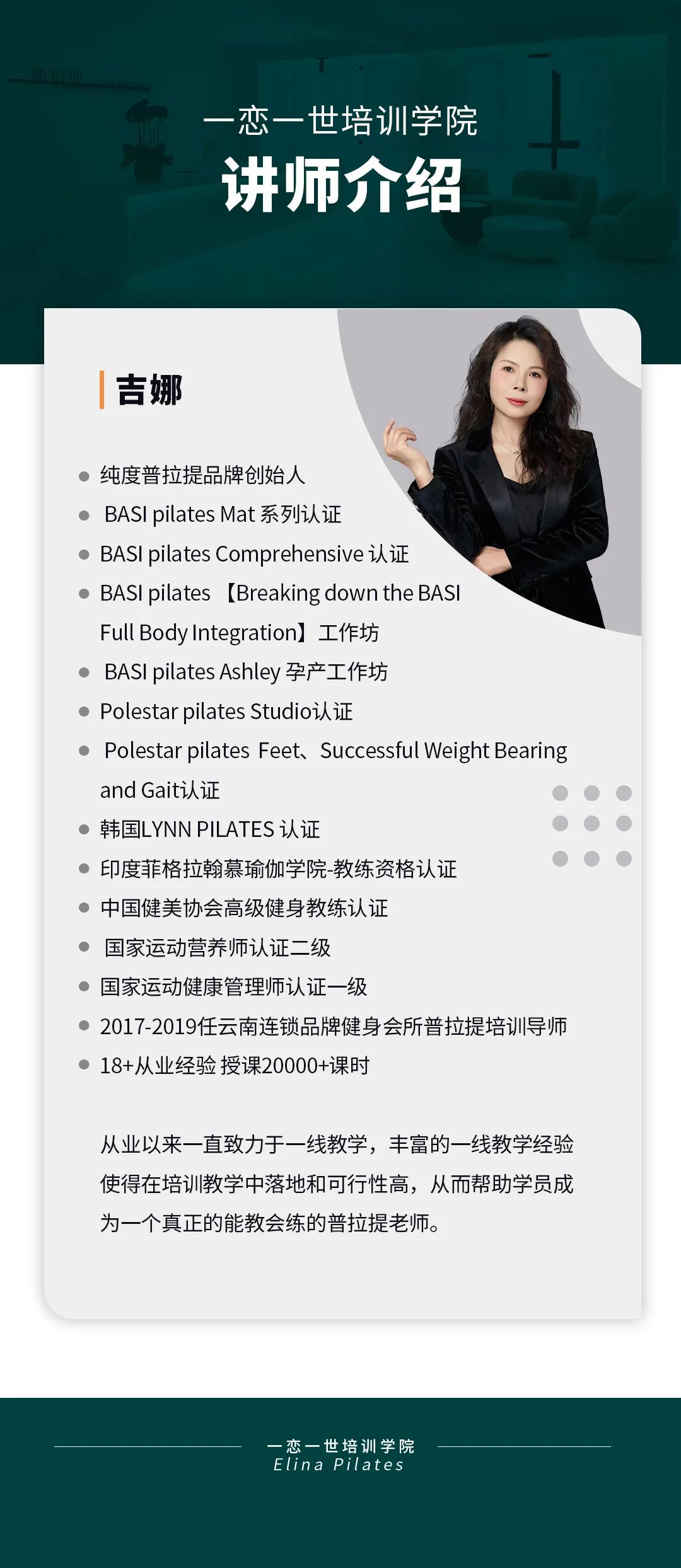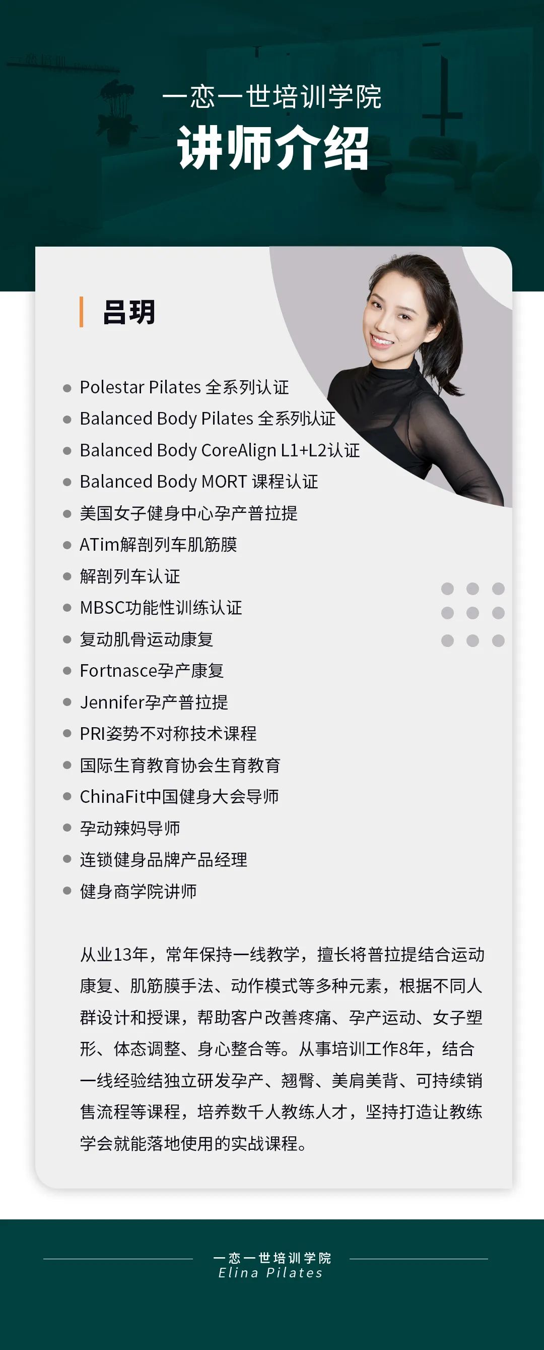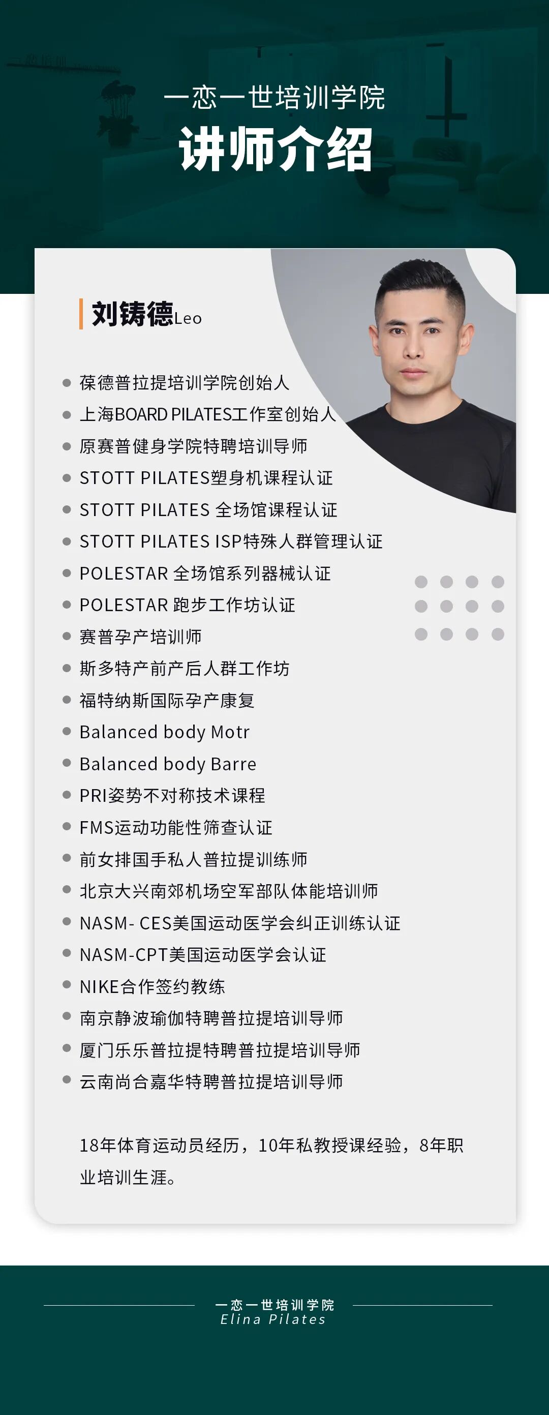 普拉提大器械 认识「一恋」 作为欧洲第一普拉提器械品牌,国际普拉提联盟PMA成员,以及全球首屈一指的普拉提器械生产和销售中心,一恋在业界享有崇高的地位。 一恋一世培训学院成立仅一个月,就吸引了600多名学员,每月培训近千人次,这些数字背后是学员对我们的信赖和支持。 五天四晚,会学到什么? ELINA 课程概要 SYLLABUS DESIGNING