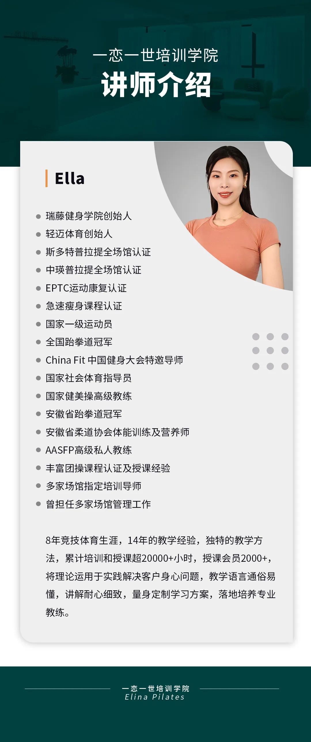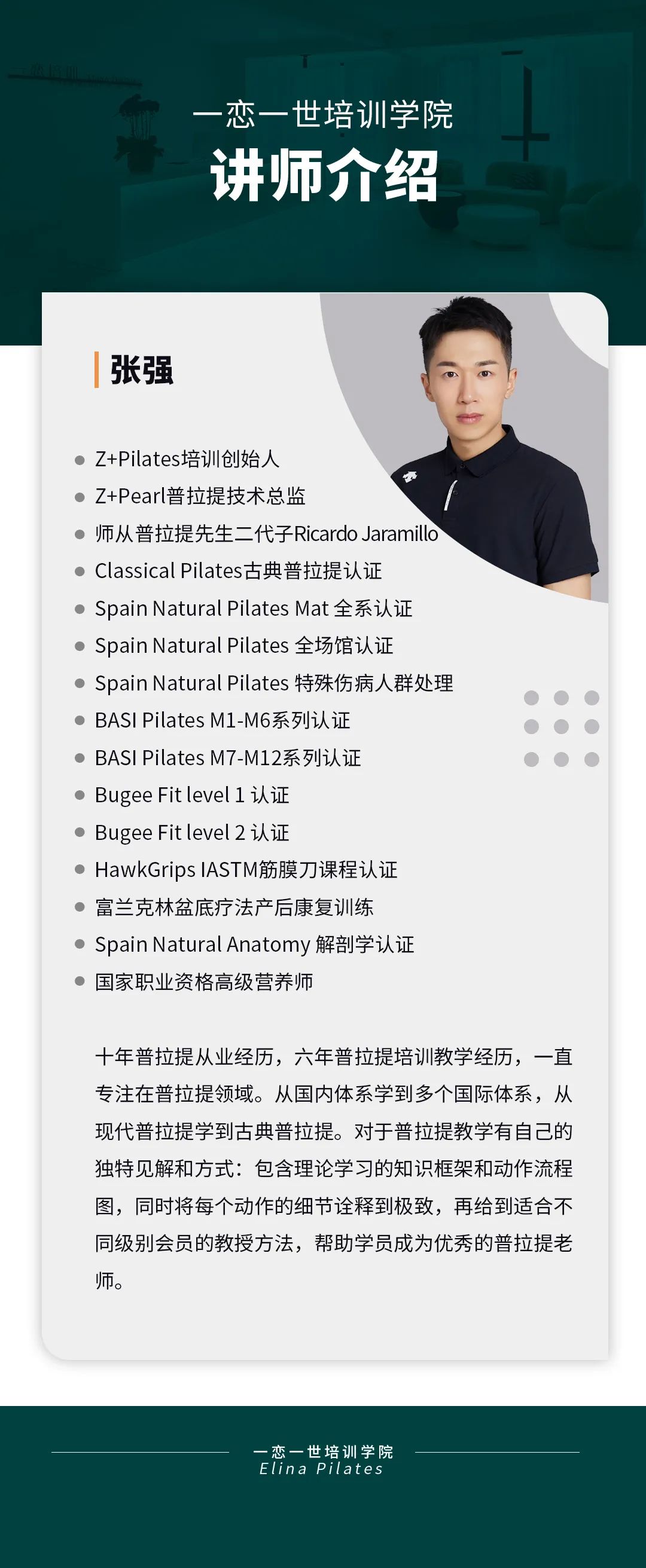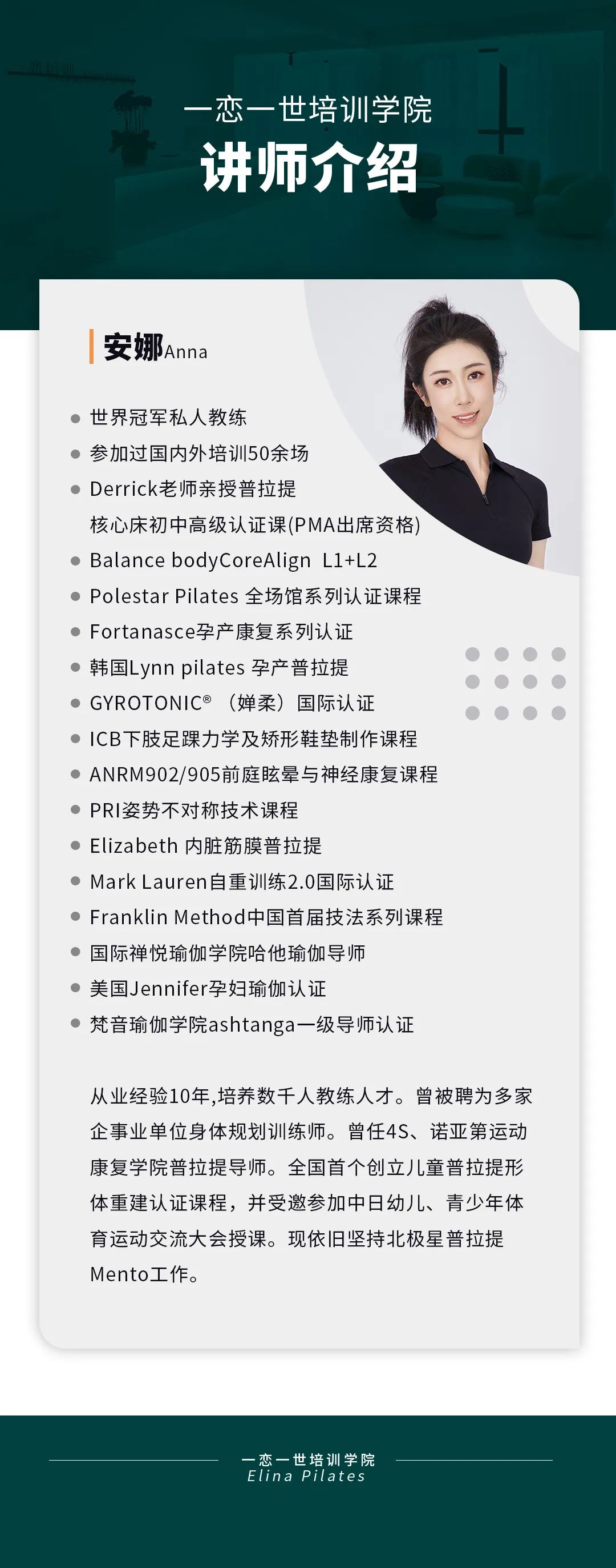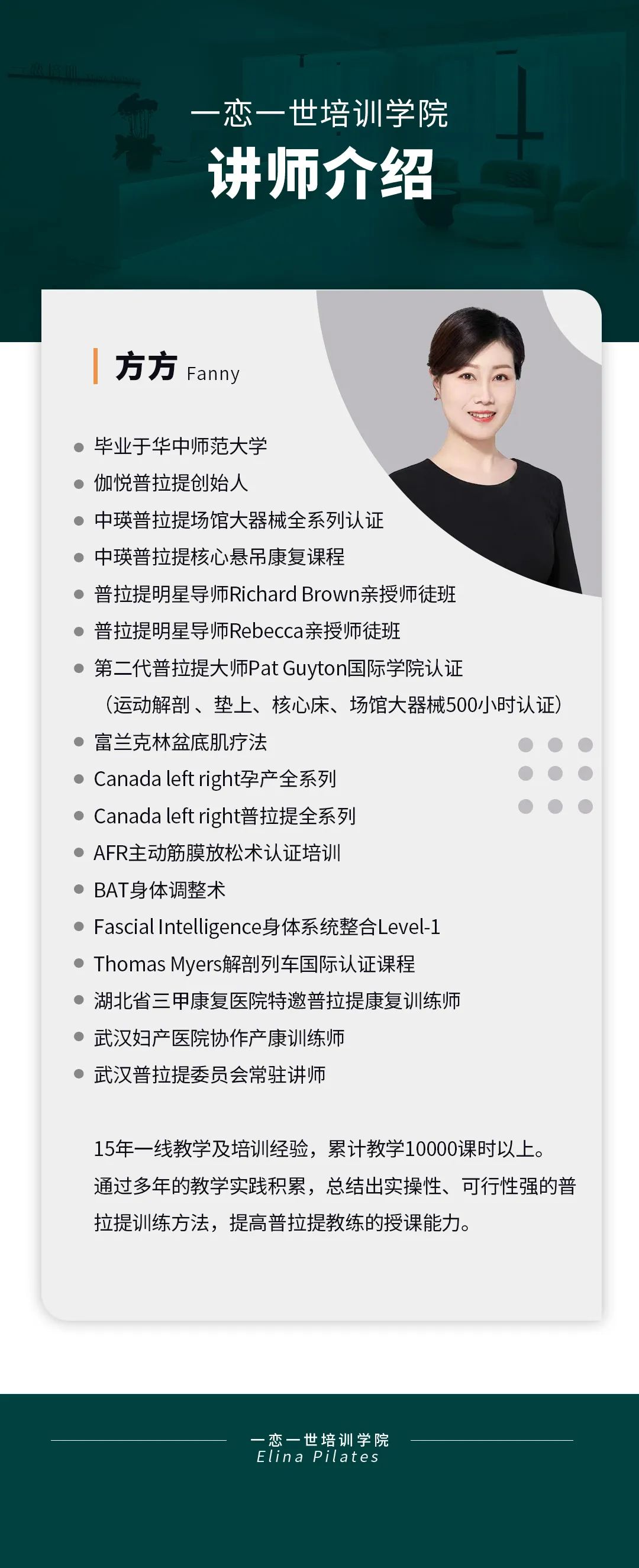 普拉提大器械 认识「一恋」 作为欧洲第一普拉提器械品牌,国际普拉提联盟PMA成员,以及全球首屈一指的普拉提器械生产和销售中心,一恋在业界享有崇高的地位。 一恋一世培训学院成立仅一个月,就吸引了600多名学员,每月培训近千人次,这些数字背后是学员对我们的信赖和支持。 五天四晚,会学到什么? ELINA 课程概要 SYLLABUS DESIGNING