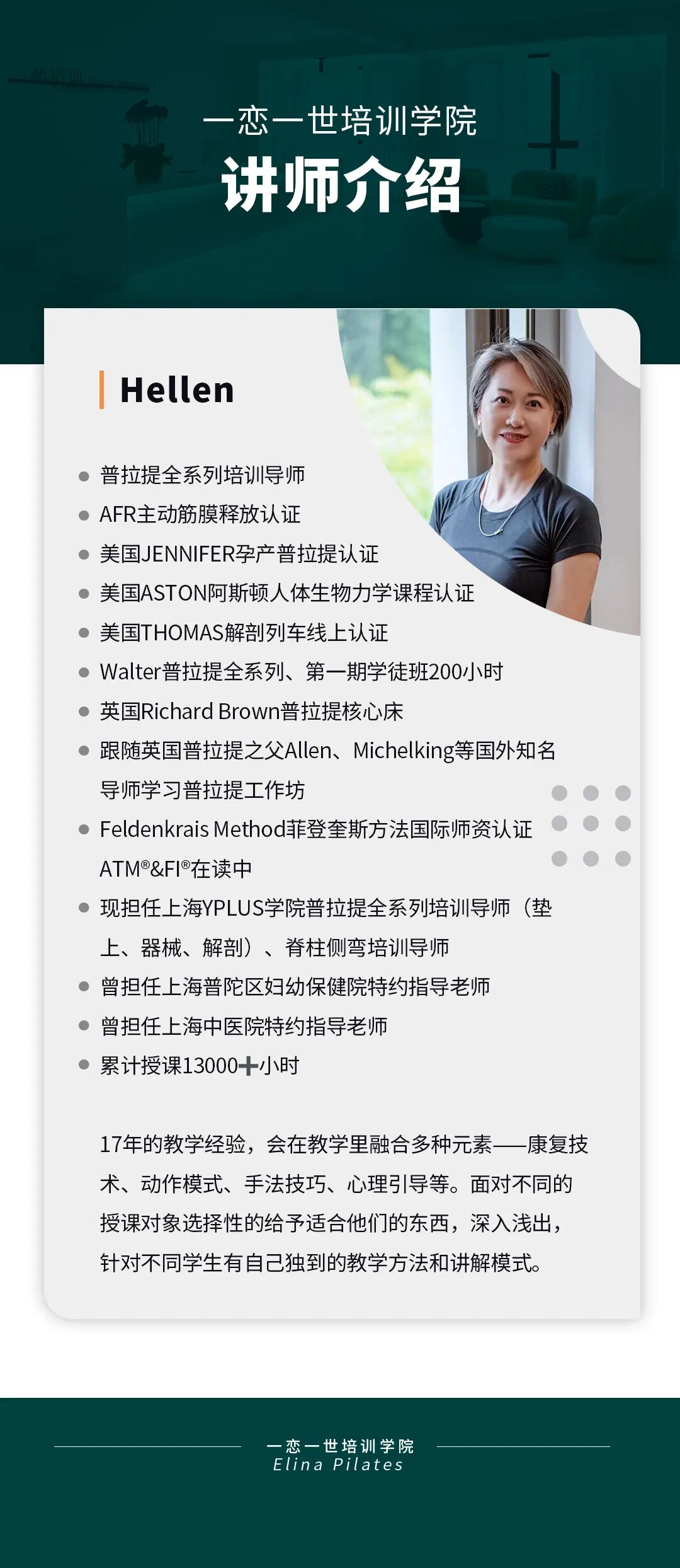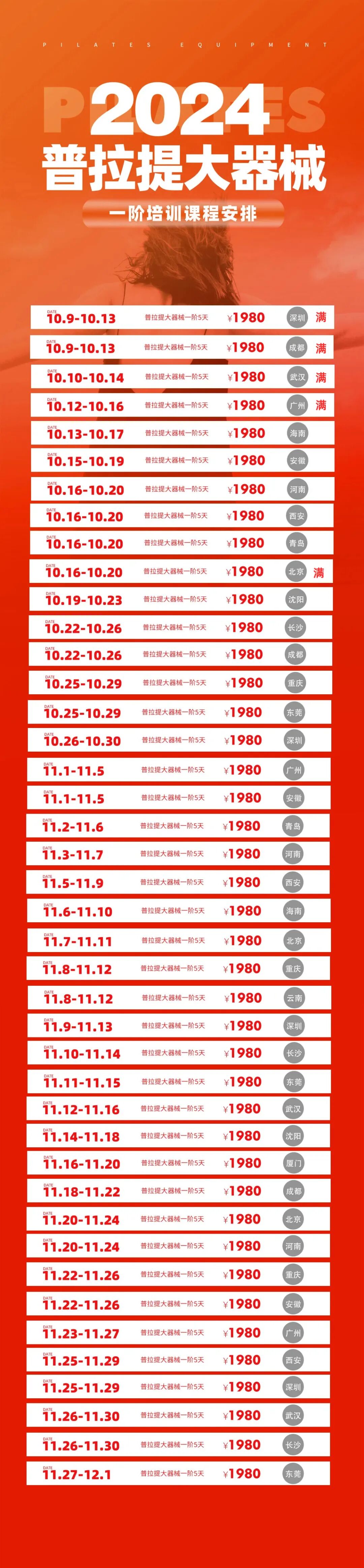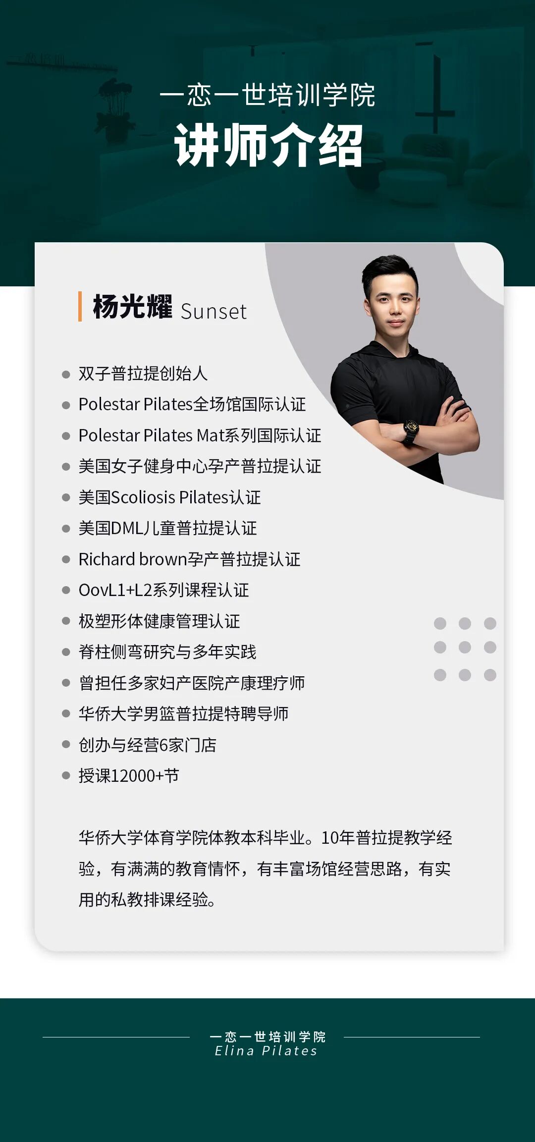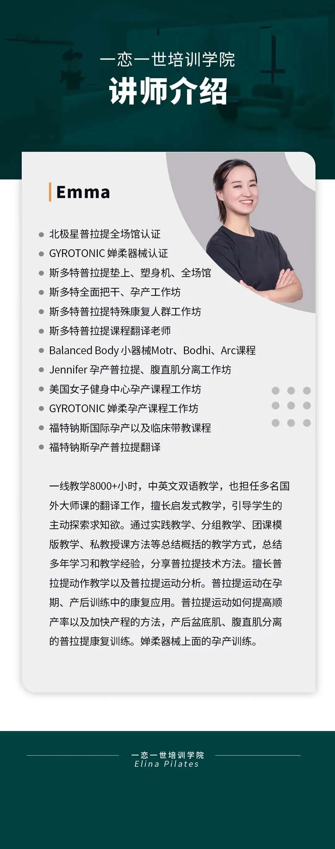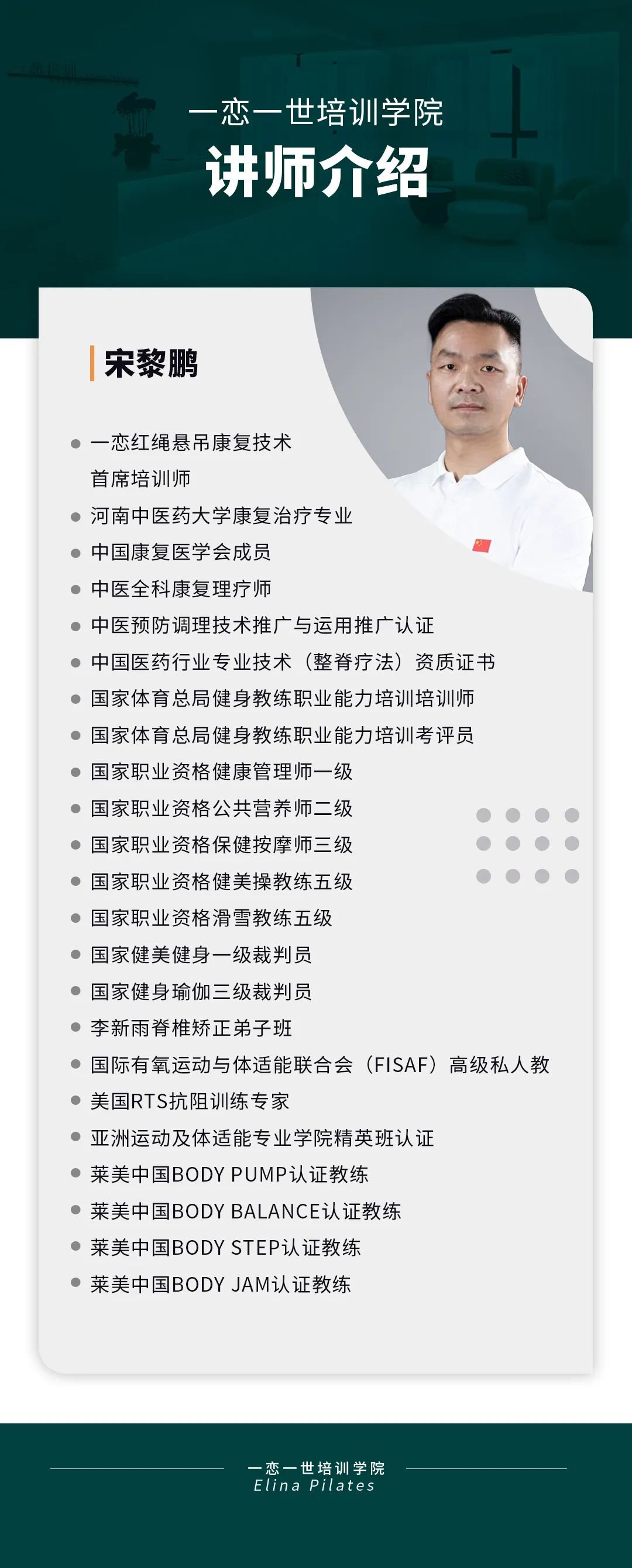 普拉提大器械 认识「一恋」 作为欧洲第一普拉提器械品牌,国际普拉提联盟PMA成员,以及全球首屈一指的普拉提器械生产和销售中心,一恋在业界享有崇高的地位。 一恋一世培训学院成立仅一个月,就吸引了600多名学员,每月培训近千人次,这些数字背后是学员对我们的信赖和支持。 五天四晚,会学到什么? ELINA 课程概要 SYLLABUS DESIGNING
