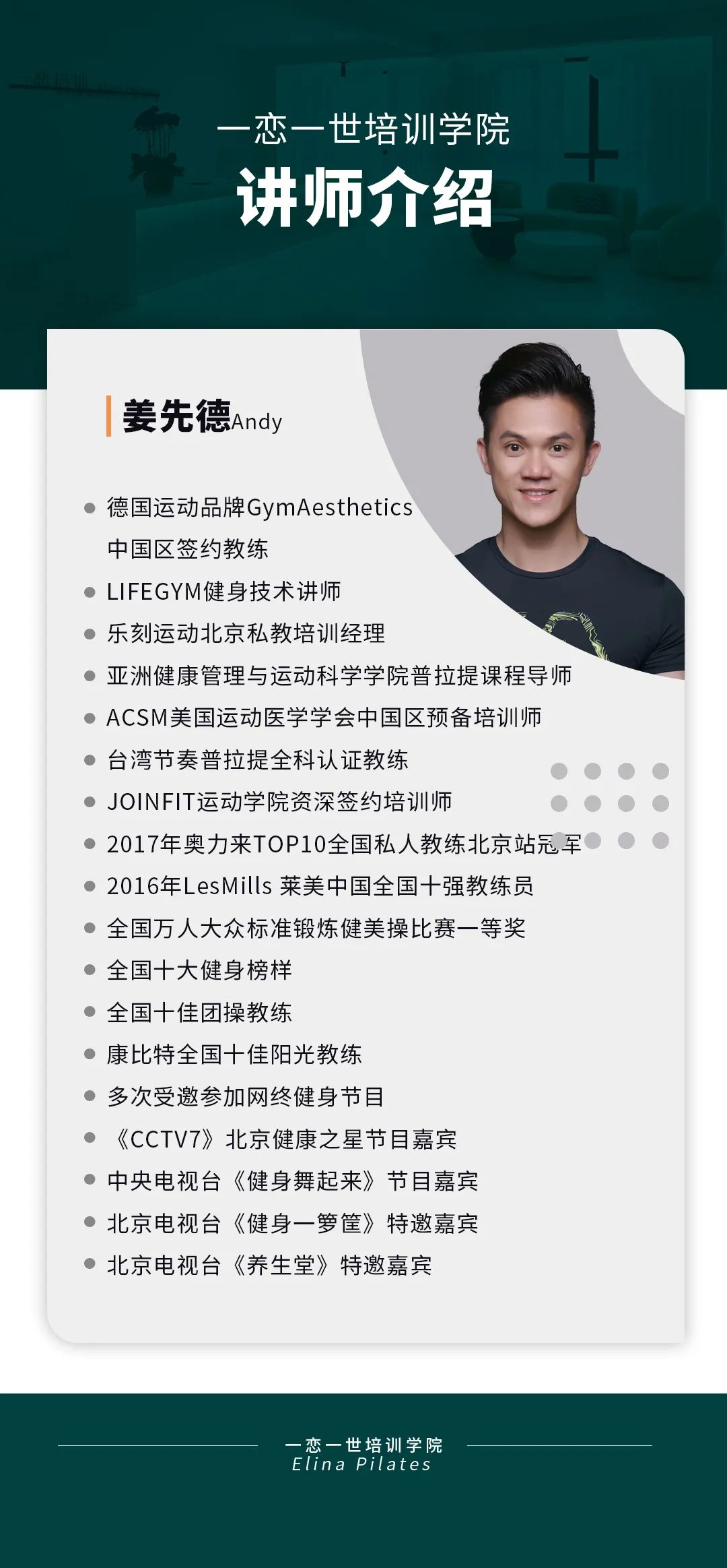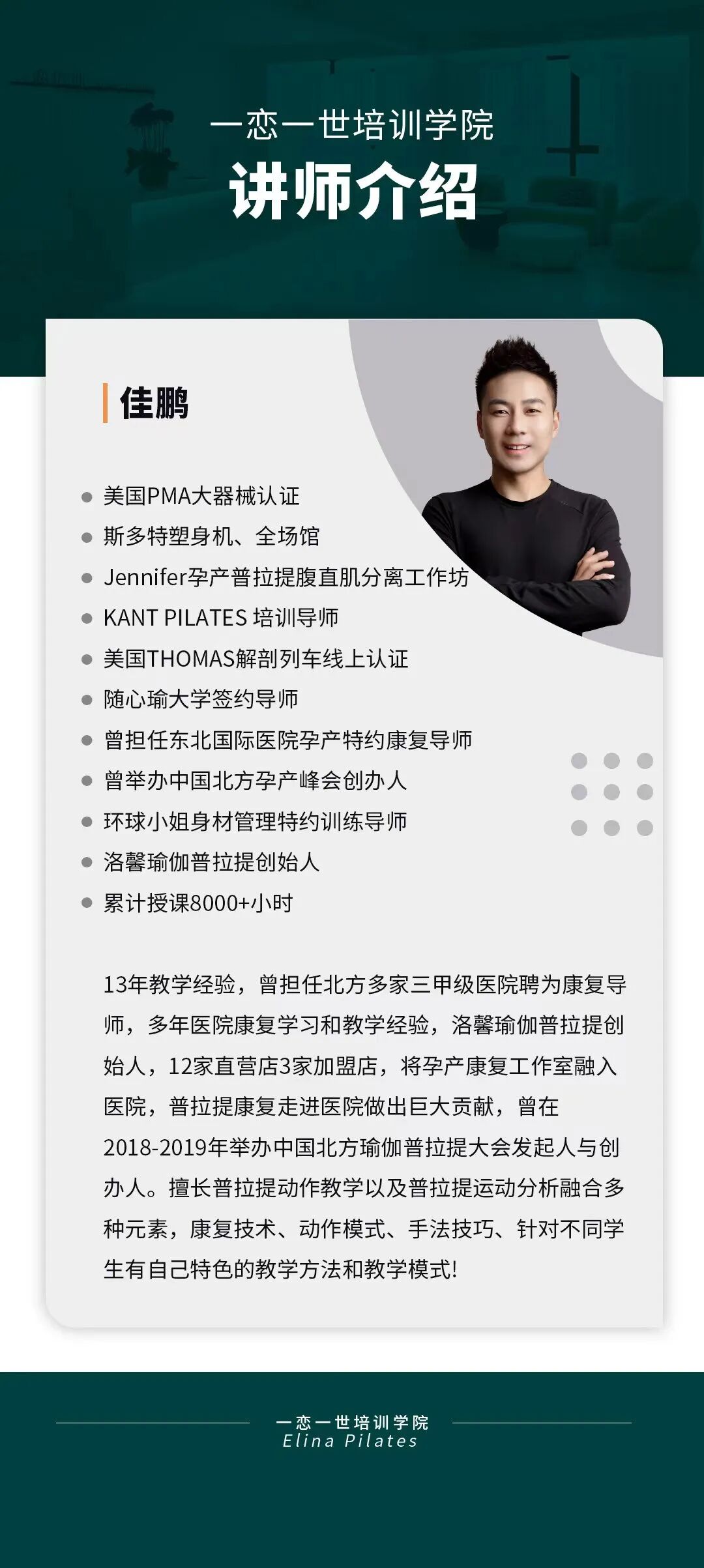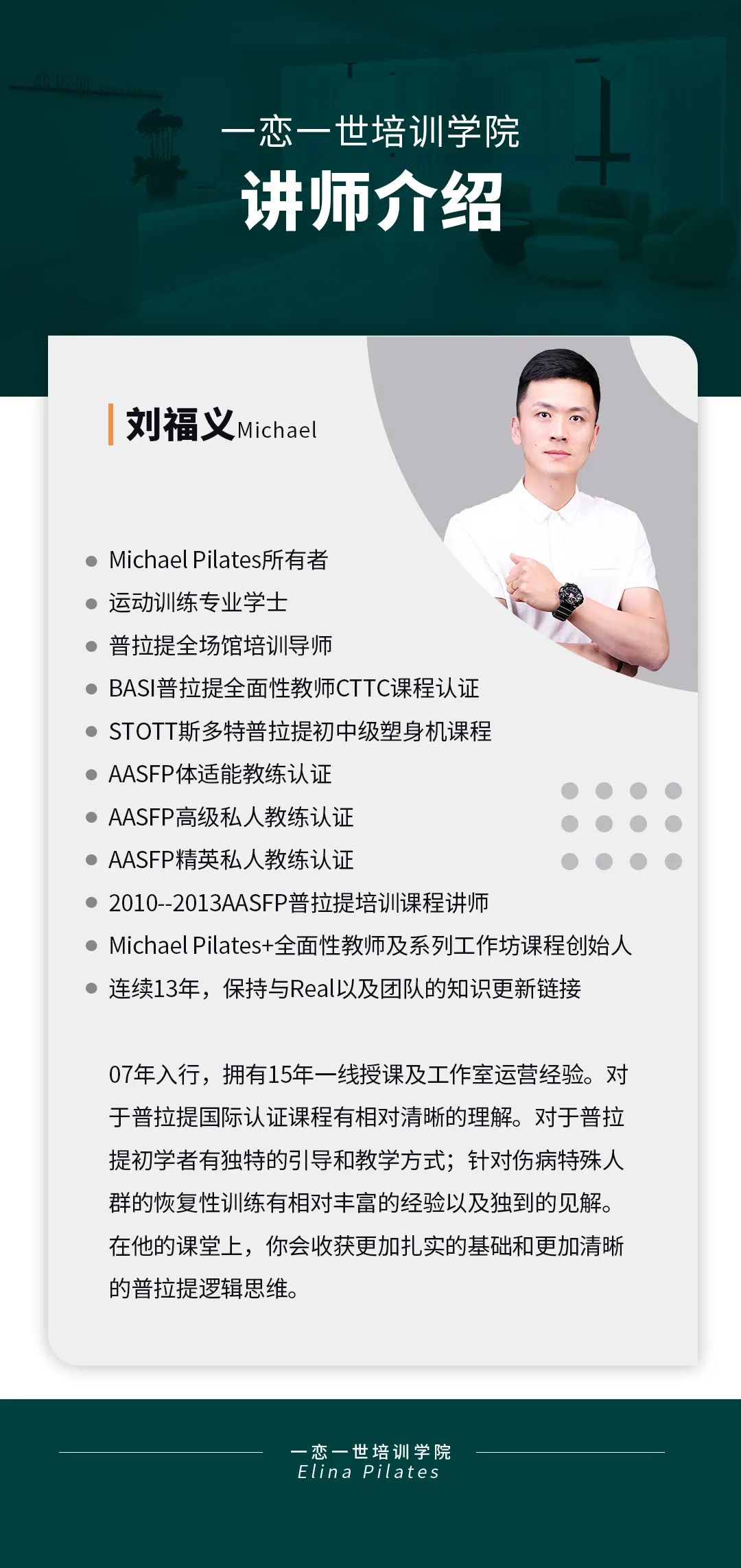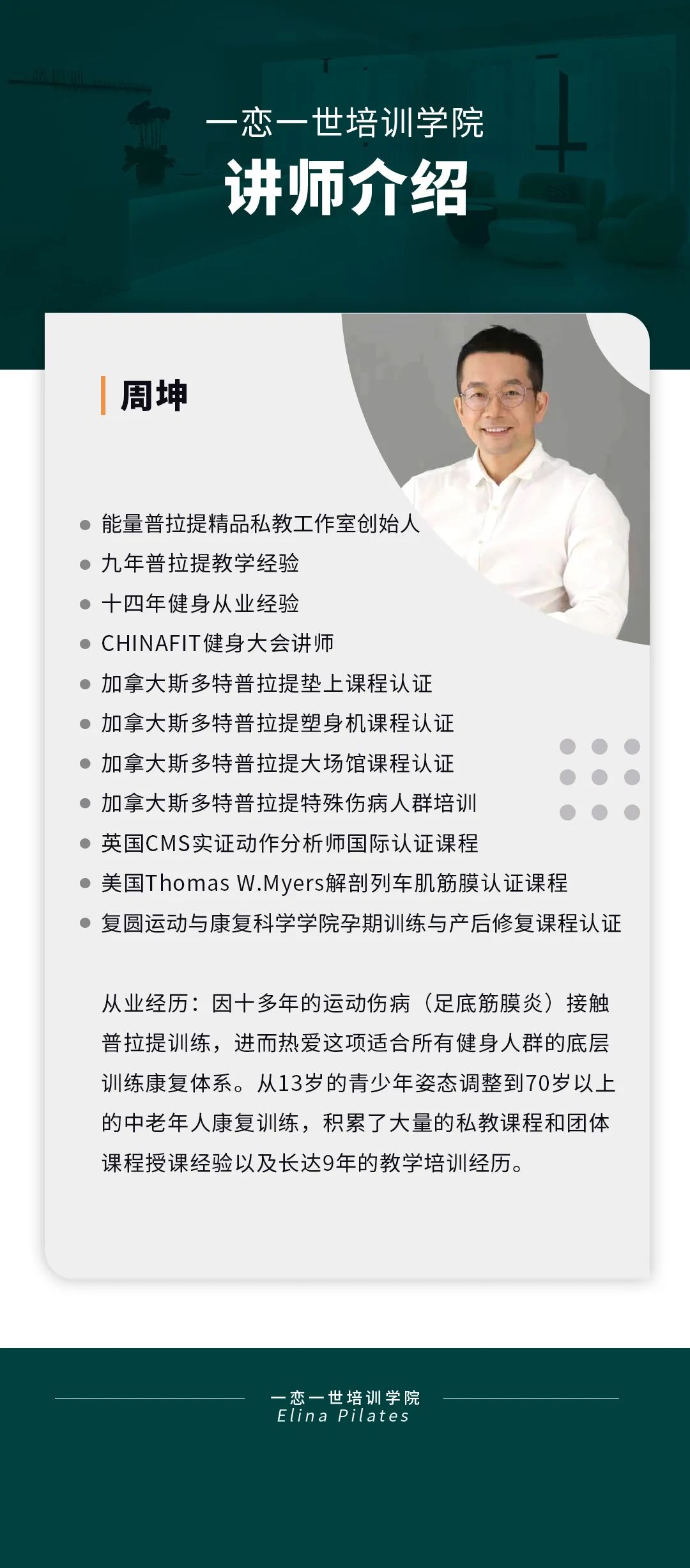 普拉提大器械 认识「一恋」 作为欧洲第一普拉提器械品牌,国际普拉提联盟PMA成员,以及全球首屈一指的普拉提器械生产和销售中心,一恋在业界享有崇高的地位。 一恋一世培训学院成立仅一个月,就吸引了600多名学员,每月培训近千人次,这些数字背后是学员对我们的信赖和支持。 五天四晚,会学到什么? ELINA 课程概要 SYLLABUS DESIGNING