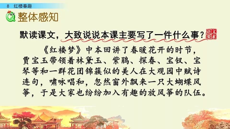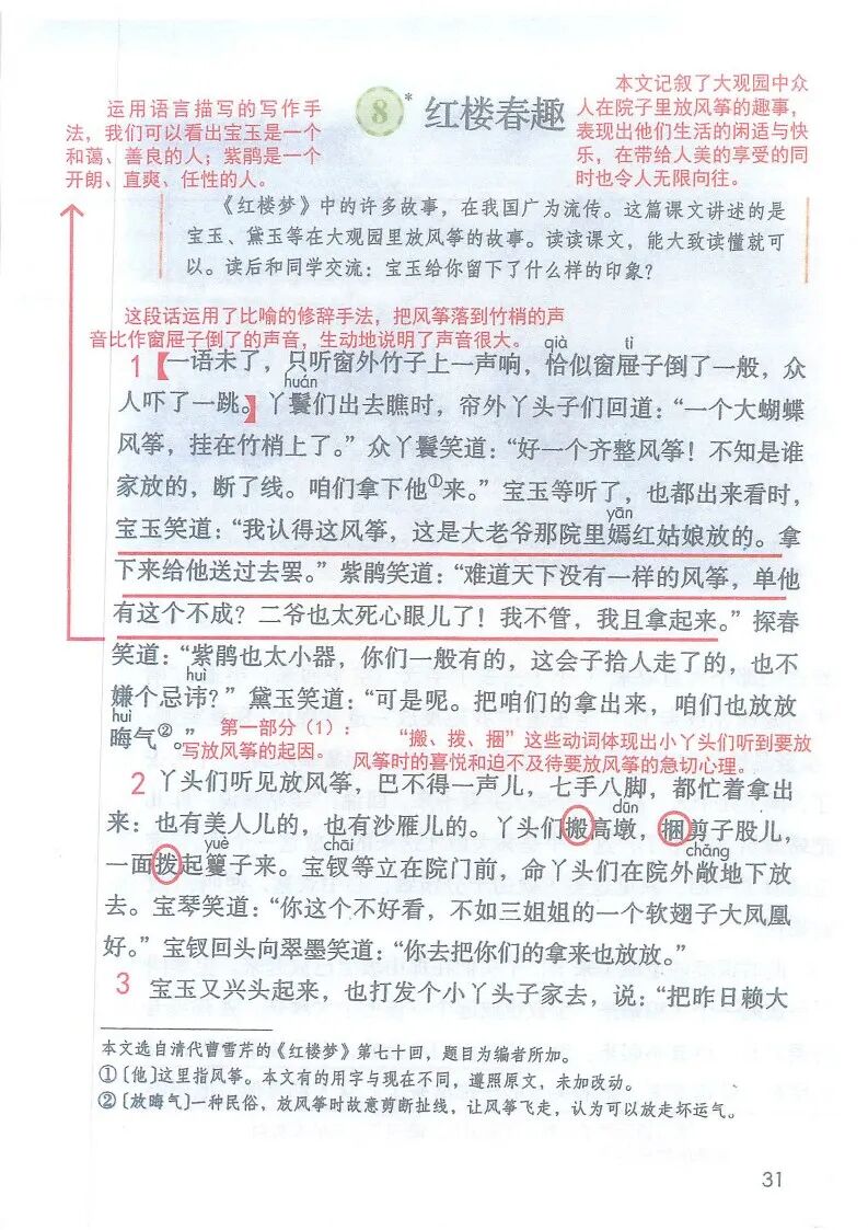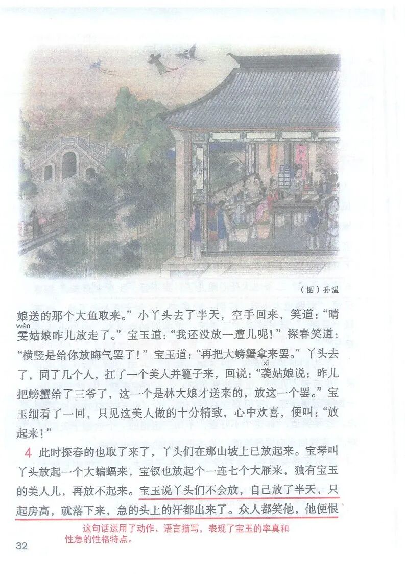 (2)众人都拿自己的风筝来放,独有宝玉的风筝飞到房子那么高便落下来了,急得他头上出汗,众人都笑他。