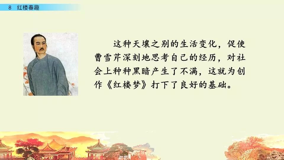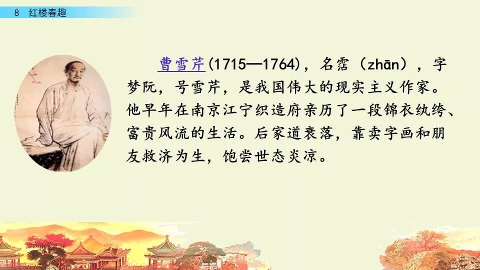 曹雪芹,名霑,字梦阮,号雪芹,又号芹溪、芹圃。清代著名文学家,小说家。他出身于一个“百年望族”的大官僚地主家庭,因家庭的衰败饱尝人世辛酸,后以坚韧不拔之毅力,历经多年艰辛创作出极具思想性、艺术性的伟大作品《红楼梦》。