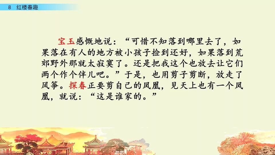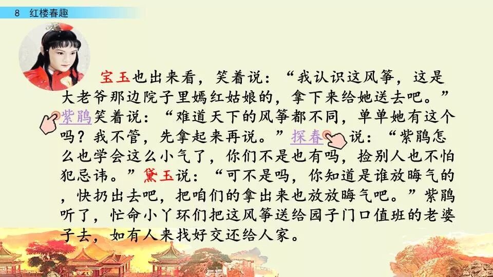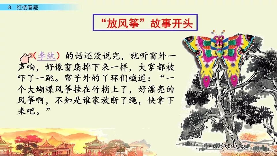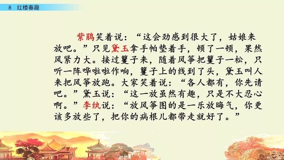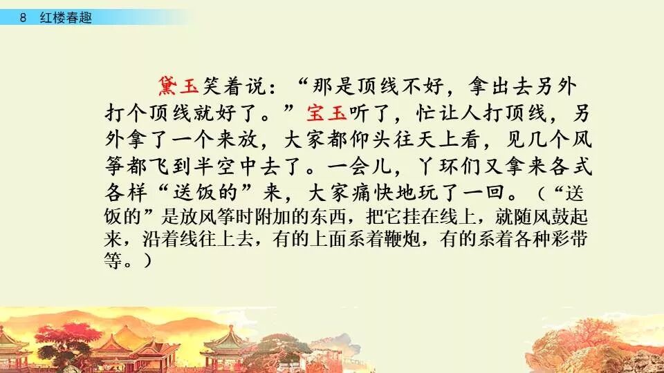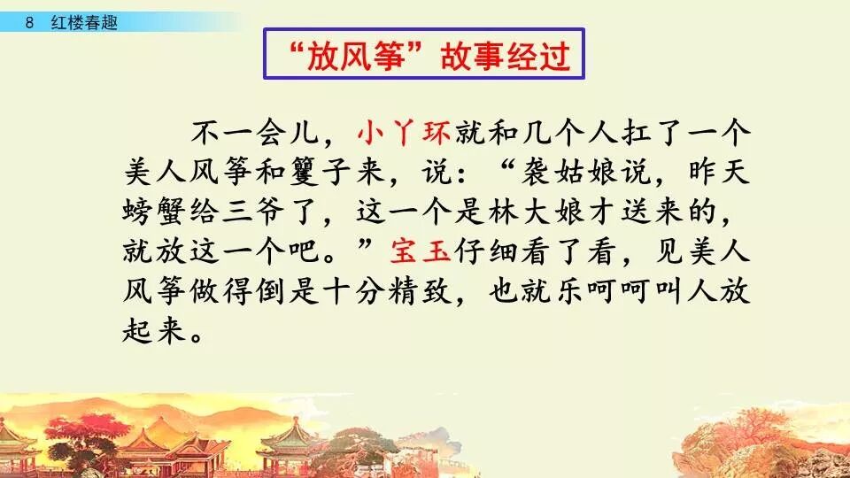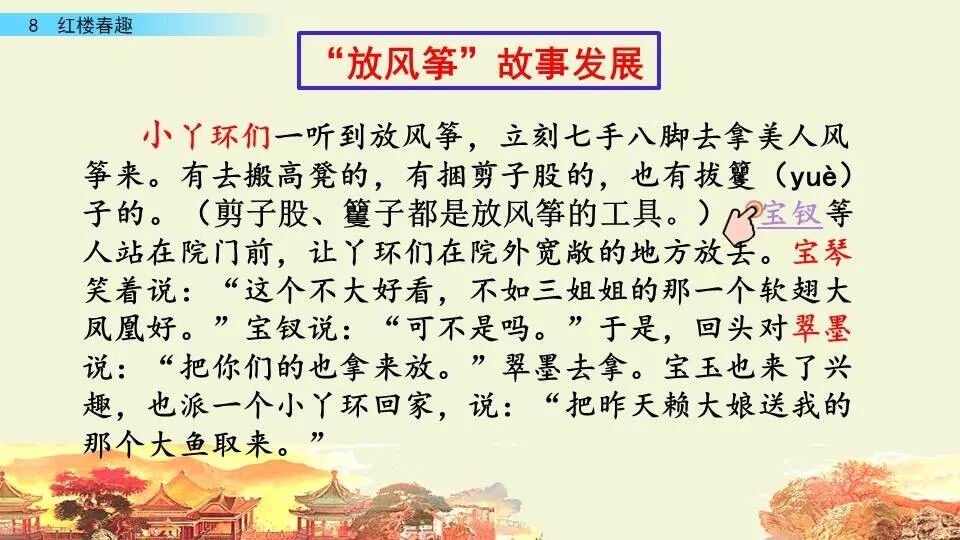 (1)黛玉提议放风筝,小丫头们急忙七手八脚地去拿风筝,准备放风筝的工具。