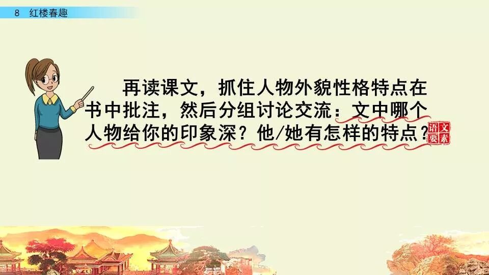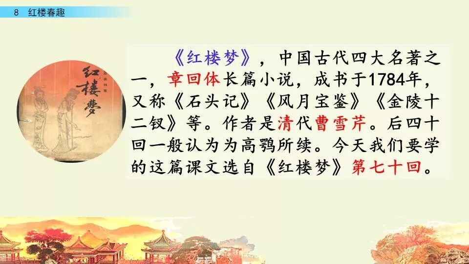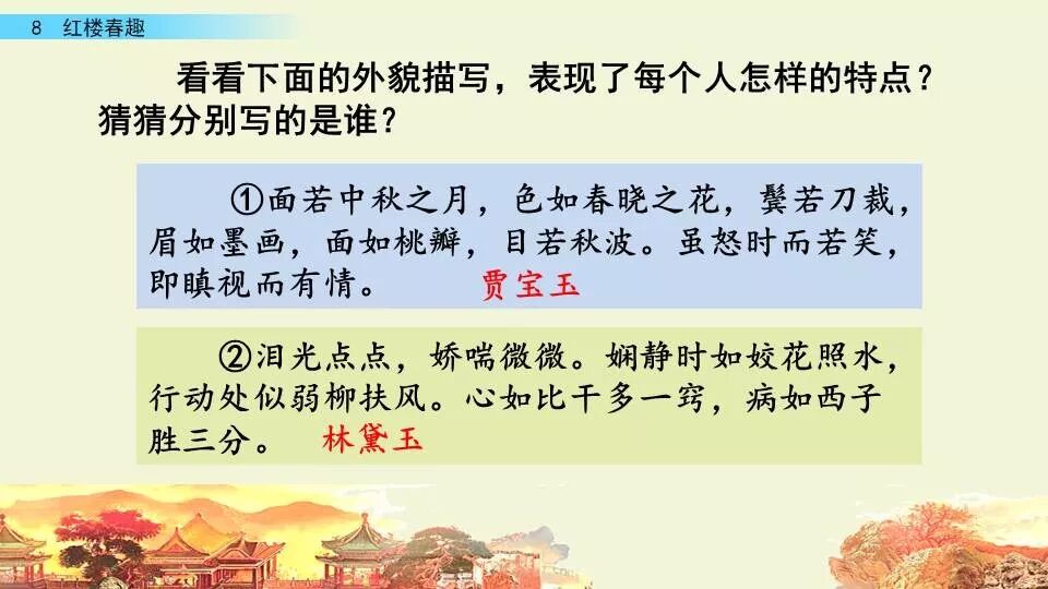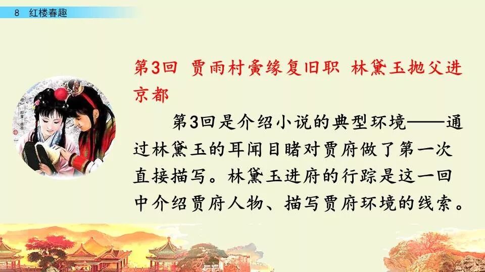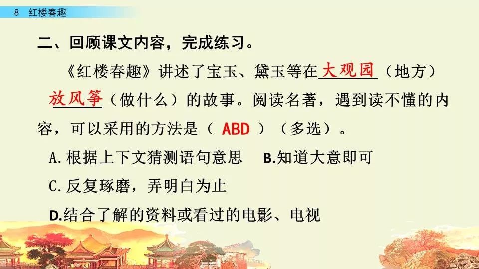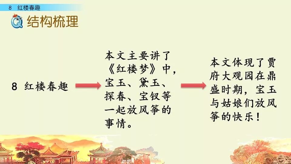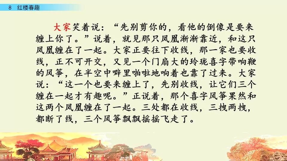 (1)黛玉提议放风筝,小丫头们急忙七手八脚地去拿风筝,准备放风筝的工具。