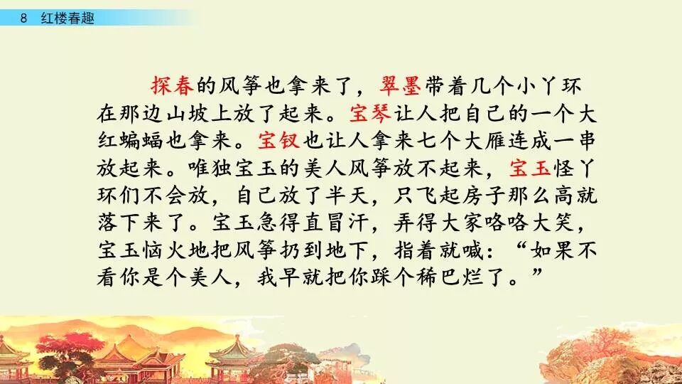 3、宝玉说丫头们不会放, 自己放了半天,只起房高,便落下来了。急的宝玉头上出汗,众人又笑。宝玉恨的掷在地下,指着风筝道:“若不是个美人,我一顿脚跺个稀烂。