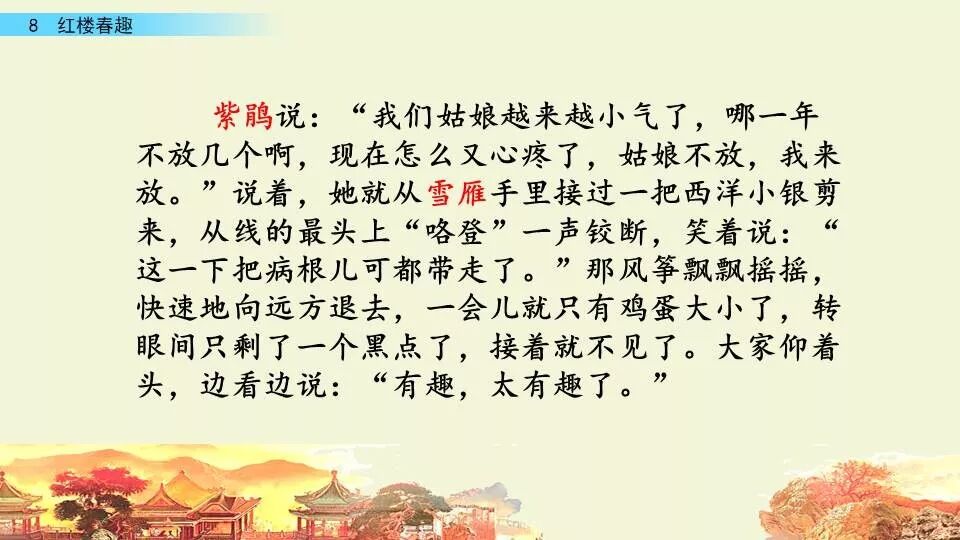 5、紫鹃笑道:“这一回的劲大,姑娘来放罢。”黛玉听说,用手帕垫着手,顿了一顿,果然风紧力大;接过籰子来,随着风筝的势将籰子一松,只听一阵豁剌剌响,登时籰子线尽。