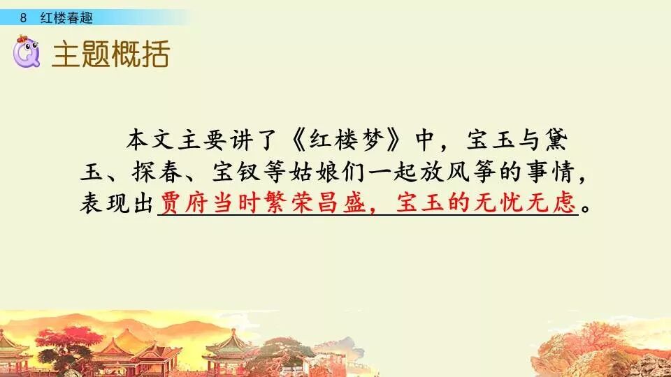本文记叙了贾宝玉和众姐妹、丫头们在大观园放风筝的经过,突出了他们放风筝时的自由快乐,表现了大观园儿女的童真童趣和充满青春朝气的活力,体现了大家对大观园美好生活的热爱。