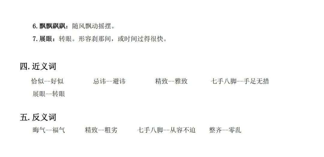 三、1.飘飘飖飖”在文中指风筝在风中随风飘动。它的近义词有飘飘洒洒、飘飘悠悠、摇摇荡荡、摇摇晃晃、飘飘忽忽、飘飘荡荡等。“飘飘飖飖”写出了风筝在天空中飘飞的姿态美,换成其他词语不能表达出这样的意思。