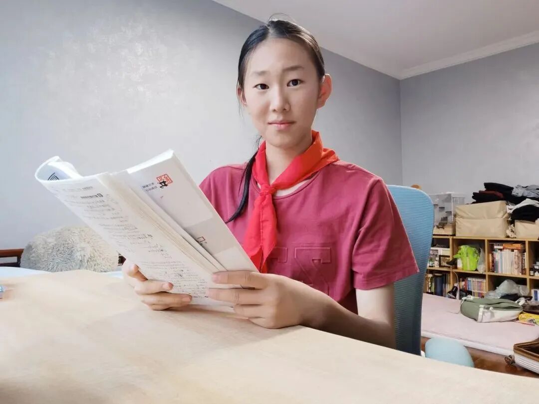 贾舒然品学兼优,作为红领巾讲解员,她多次前往中国人民抗日战争纪念馆做讲解。为了讲好傅常将军刻在灯柜上的家书,她阅读研究傅常将军的生平和抗战背景,观瞻灯柜原件,反复研读家书内容,逐字逐句体会其中的深情厚谊。