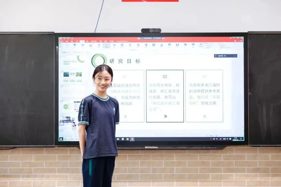 上初中后,她通过电视里的新闻了解到了中国的双碳目标,并偶然间发现一个盲点——北京市行道树碳汇数据相对匮乏,由此她开始了实地调查研究,针对城市行道树固碳能力提出了一种全新的行道树碳储量测算方法,引入了不同树种固碳能力的研究方案。这次在碳汇领域的研究成果也吸引了科普时报、西城区官方公众号等媒体的采访报道,评价她“展现了青少年在科技创新方面的才华与潜力”。