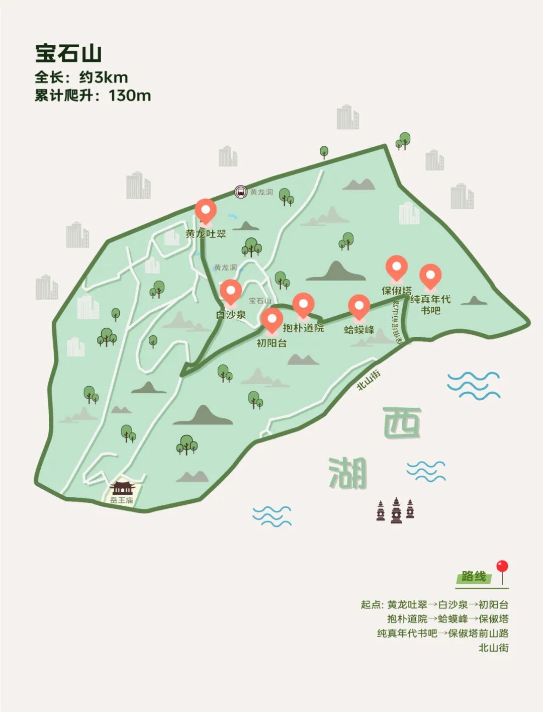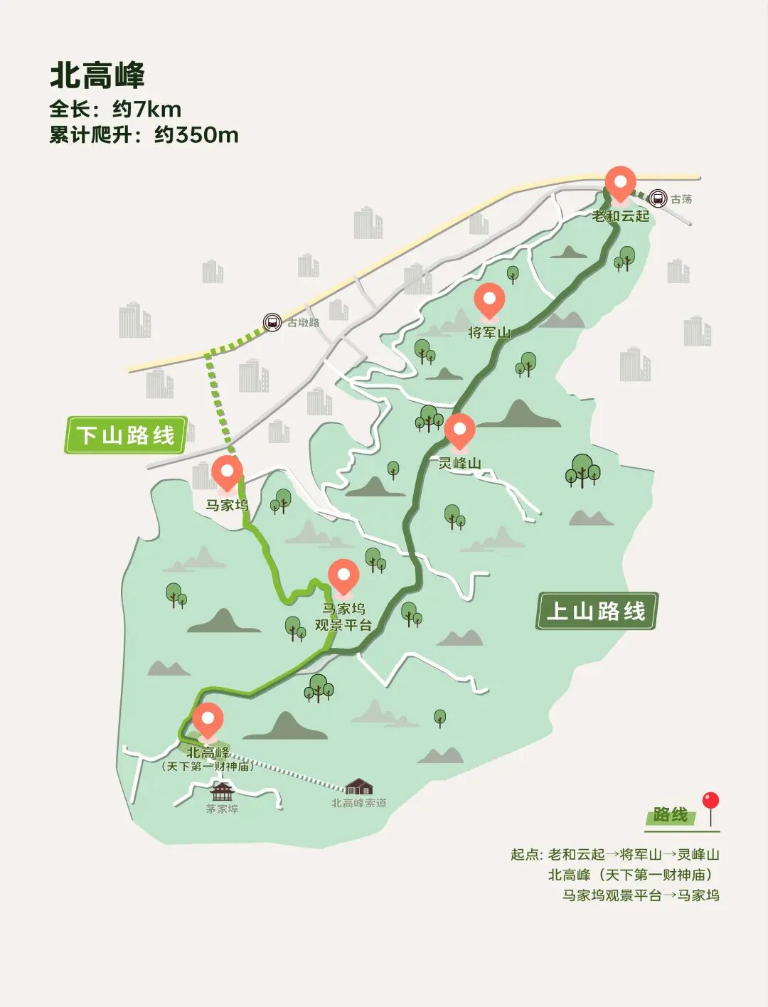 路线:黄龙吐翠→白沙泉→初阳台→抱朴道院→蛤蟆峰→保俶塔→纯真年代书吧→保俶塔前山路→北山街宝石山位于西湖北面,在新西湖十景评选中被命名为“宝石流霞”。山顶蛤蟆峰周围没有视线遮挡,是俯瞰西湖、观赏日出日落以及拍照打卡的绝佳位置。宝石山不高,山路多为石阶路,野路较少,对登山装备要求也不高,对新手很友好。1.蛤蟆峰一片区域较为陡峭,岩壁较滑,景色虽好但要格外注意安全;2.公共交通:地铁3号线黄龙洞C口出站,步行至黄龙吐翠。路线:老和云起→将军山→灵峰山→北高峰(天下第一财神庙)→马家坞观景平台→马家坞村在杭州,最吸引年轻人的当然要数北高峰上的天下第一财神庙。老和云起至北高峰上山路线多为石阶路,整体坡度较为平缓,沿途植被茂盛,建议穿着登山鞋,长袖长裤,以免蚊虫叮咬。马家坞观景台走廊为木栈道,能够俯瞰西溪一带,是拍照打卡的“不二之选”,但来之前需看好天气,且沿途遮挡少,建议带好防晒用品。2.下山时还可以选择灵隐方向或乘坐北高峰索道,但索道排队时间较长;