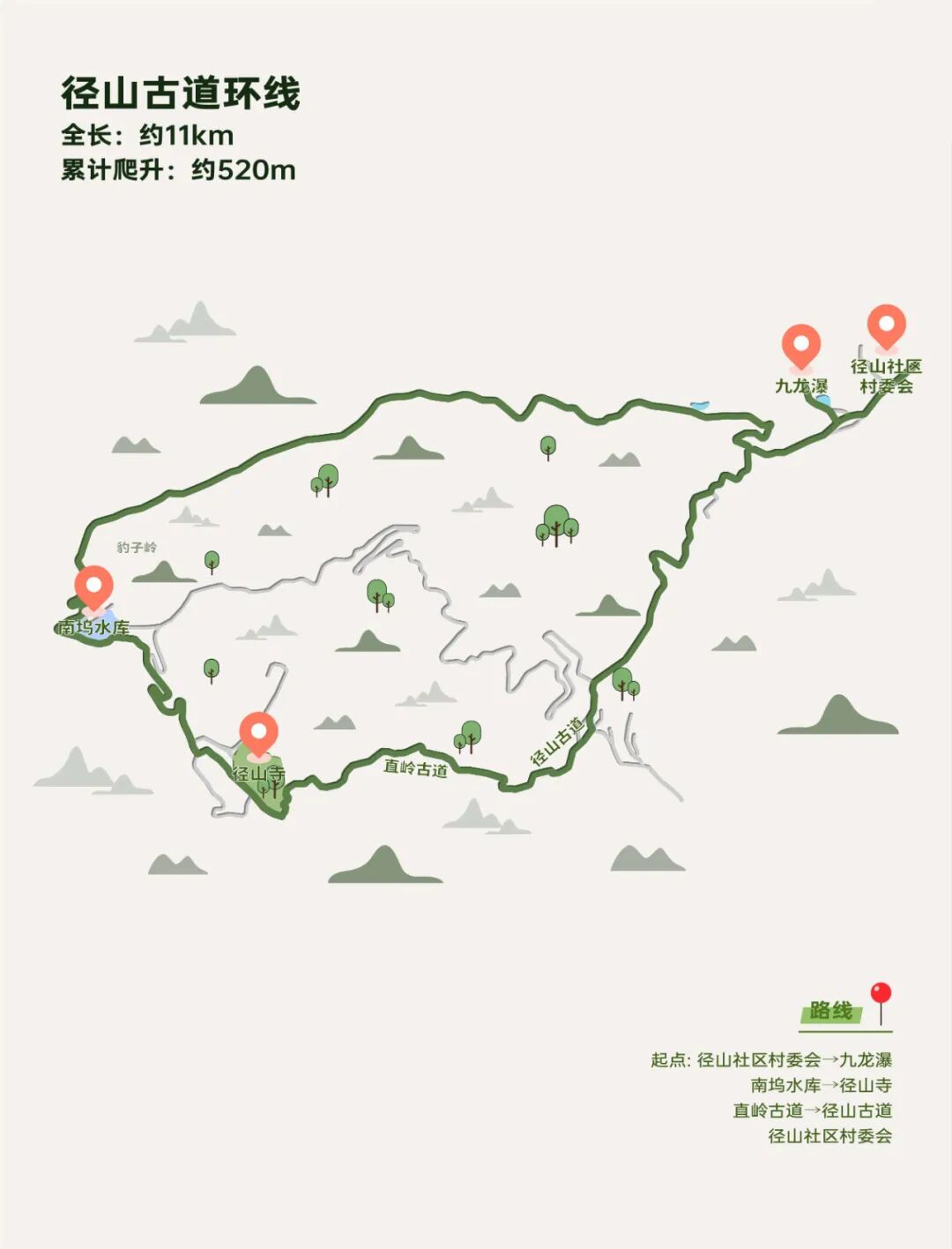 3.公共交通:地铁3号线古荡站B口出,步行450米至老和云起,开始爬山;下山后至马家坞村,可步行达地铁3号线古墩路站。路线:径山社区村委会→九龙瀑→南坞水库→径山寺→直岭古道→径山古道→径山社区村委会从径山社区村委会开始,逆时针走环线,前半段为未被开发的野路,后半段为径山古道下坡段,建议穿着登山鞋,手持登山杖,由于路线较长,所以最好背个户外双肩包带上一些补给食品。环线整体爬升较为平缓,途径九龙瀑、茶园、径山寺等景点,风景优美,空气清新,对新手也友好。如果觉得上述路线还是有难度,读城君还整理了两条低强度、缓爬坡的路线,照样追逐春天。