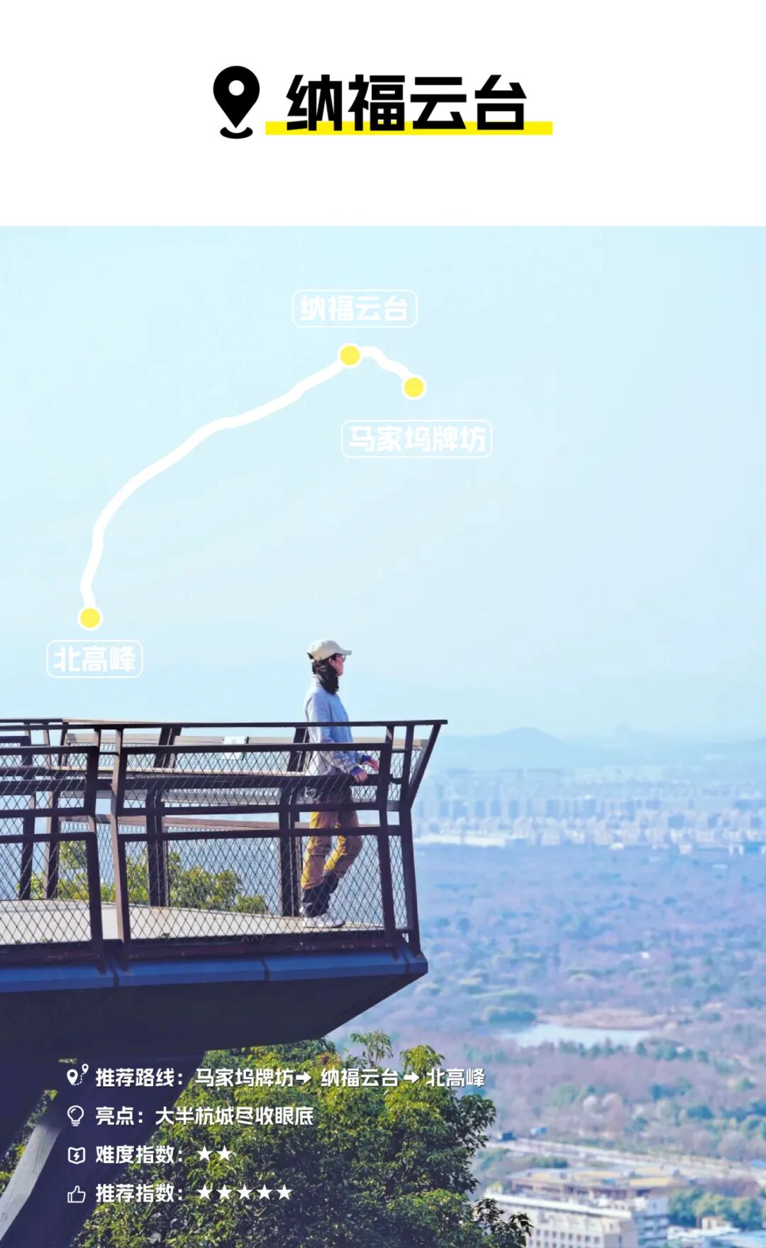 如果觉得上面说的北高峰路线挑战太大,那可以先选一个小目标,比较好爬的马家坞观景平台,有个好听的名字叫纳福云台。