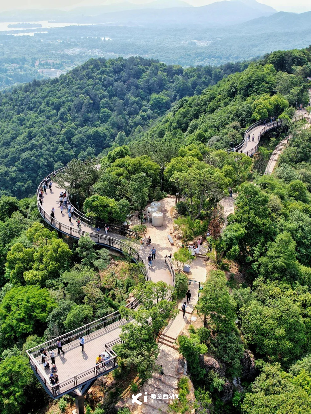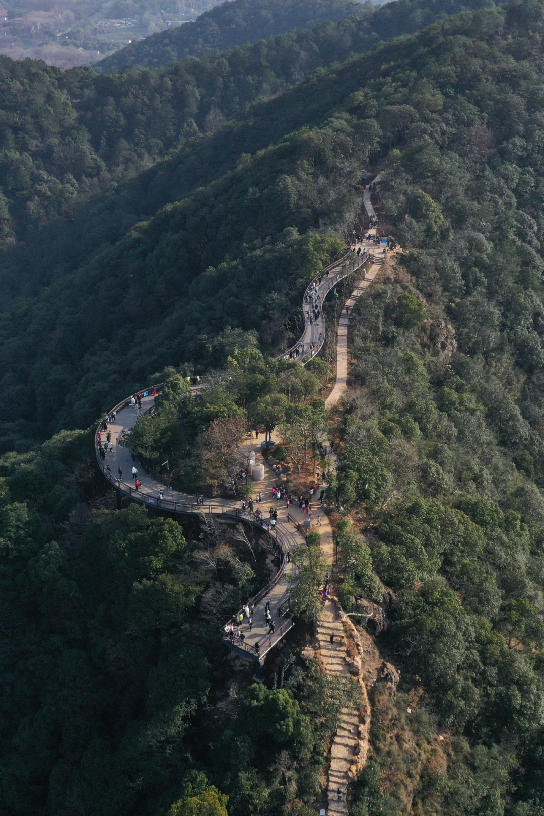 一路爬到纳福云台,云台比想象中要小一些,山顶S形的空中观景栈道被绿树环抱,大概有100米长,弯弯延延。