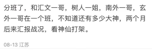 今年附中增加2个国科大班,6个国科大班在奥南校区上学。作为南京最牛高中最牛班,果壳班自然是牛娃云集。据网友爆料,今年汇文、树人、南外、玄外的一哥一姐齐聚一个班,神仙打架,好不热闹!
