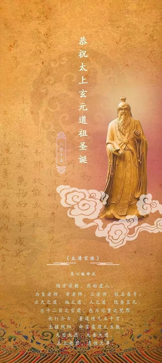 农历二月十五日,是道祖太上老君降圣之辰,太上老君,又称“太清道德天尊”、“无量度人降生天尊”、“开皇末劫天尊”等,居玉几下三皇洞神太极宫,即大赤天宫。太上老君与元始天尊、灵宝天尊,合称“三清道祖”,或“三洞教主”、“三宝君”等,是道教对信仰之“道”的人格化及对“道性”的诠释,也是道教信仰的最高尊神和无上教主。