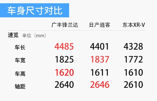 车身尺寸方面,新车长宽高分别为4485/1825/1620mm,轴距为2640mm,尺寸介于CH-R及之间,而与同级竞品相比并没有明显的尺寸优势。