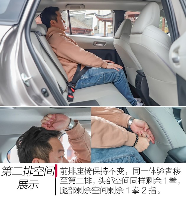 保持前排座椅位置不变,同一体验者来到后排,此时头部空间剩余一拳,腿部则有1拳2指余量,后排空间整体表现属于同级主流水准。