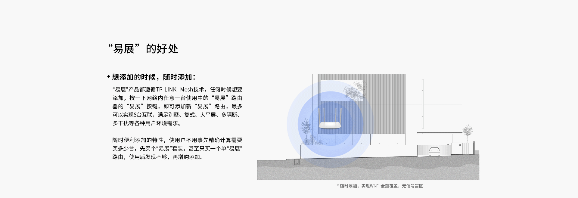 TP-LINK“易展”系列采用TP-LINK Mesh技术,将同型号或不同型号多台“易展”路由器,