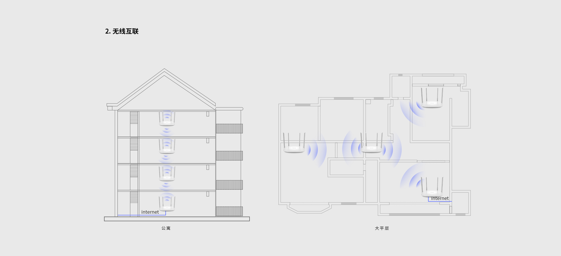 可以通过无线互联,使路由摆放更自由。局部布线的也可以部分有线,部分无线混合互联。
