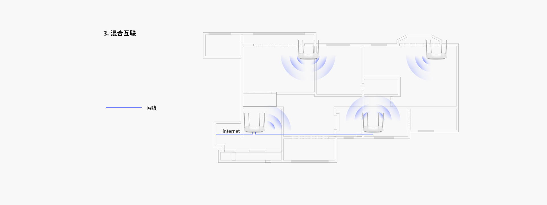 “易展”产品支持无线和网线互联。已布线家庭可以通过网线把“易展”路由连接起来,使路由间互联更稳定。没布线的