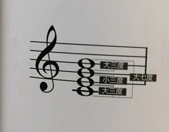 “根音”到“三音”是大三度,“三音”到“五音”是小三度,“五音”到“七音”是大三度,从“根音”到“七音”是大七度。