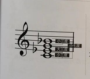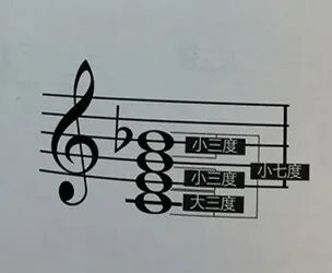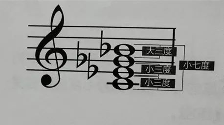 “根音”到“三音”是小三度,“三音”到“五音”是大三度,从“五音”到“七音”是小三度,从“根音”到“七音”是小七度。