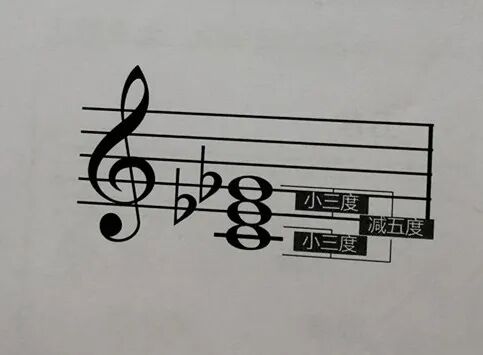 “根音”到“三音”是小三度,“三音”到“五音”也是小三度,这使得从“根音”到“五音”成了减五度。减三和弦的音响效果有一种过度的收缩感,紧张而偏激。