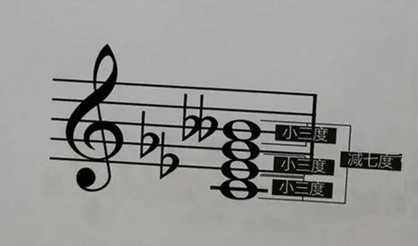 “根音”到“三音”是小三度,“三音”到“五音”是小三度,从“五音”到“七音”是小三度,从“根音”到“七音”是减七度。