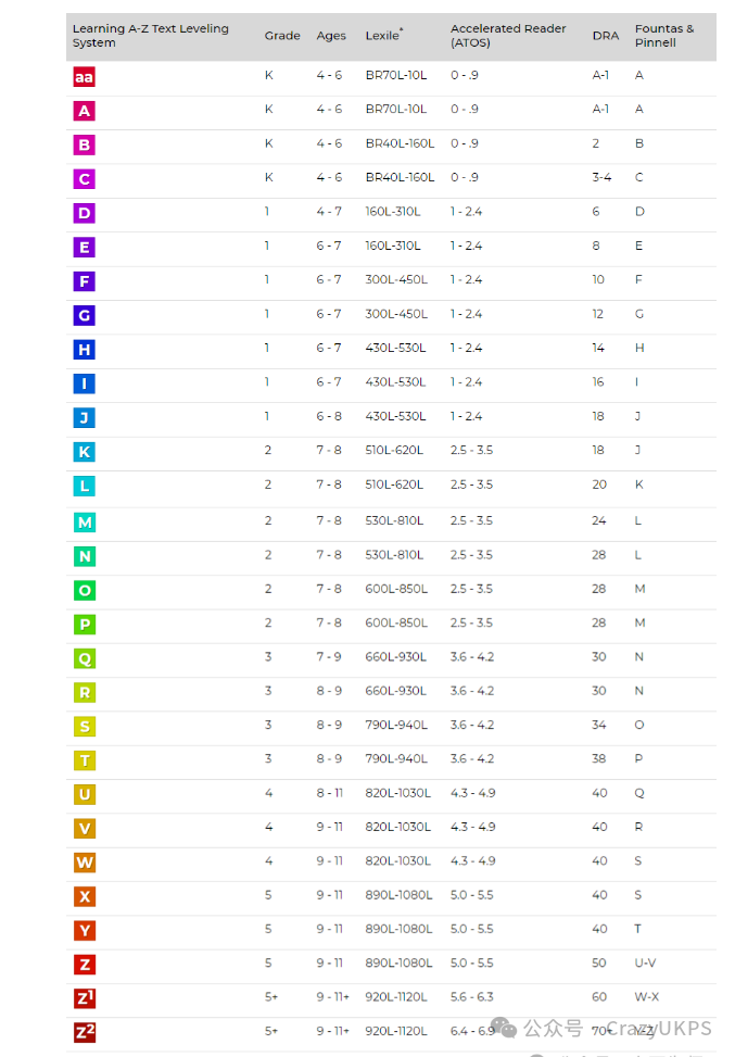 目前已经有超过5万本图书已经纳入了GRL分级体系,我们国内熟知的分级读物RAZ (Reading A-Z) 也参照了这种分级方式,具体对应可直接看下表。
