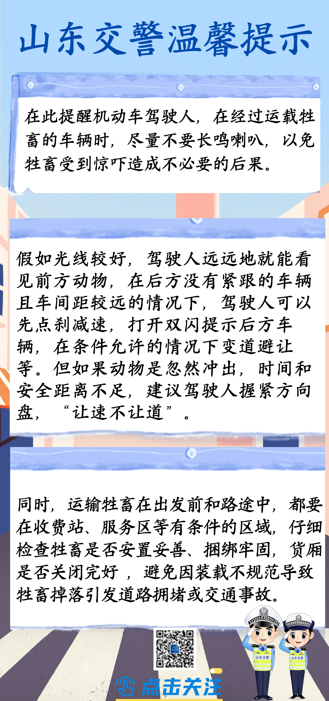 逛三 我们小时候都玩过游戏, 星期三逛三园—— 水果园,蔬菜园,动物园。 但游戏走进现实, 高速公路上成了动物园, 那就危险了。 这不,临近年关 “二师兄”和“牛魔王”可能感觉“大限将至” 相约开启“逃亡模式” 把高速公路变成了动物园 二师兄出逃记 1月10日19时许,日照高速支队东港大队民警孙斌接到指挥中心及驾驶人报警求助称:在日兰高速1KM+500M处行车道中间趴着一头猪,过往车辆纷纷紧急避让,存在严重安全隐患。 接到指令后,民警立即带领执勤人员赶赴现场,第一时间在后方做好安全警示防护,提示过往车辆减速慢行、变道避让。随后,民警及执勤人员齐心协力将“八戒”转移至安全地带,并帮助驾驶人将其抬上了货车,及时消除了安全隐患。 民警提醒驾驶人,在装载货物时一定要确认好所载货物是否安全牢固,避免类似情况的发生。驾驶人对民警的及时救助表示感谢:“幸亏有你们的帮助,要不然这头猪丢了,我的损失可就大了,真的太感谢你们了!” 继“二师兄”出逃后 勇敢牛牛 不怕困难 相继开始了它们的逃亡之旅 牛崽出逃记 1月10日14时许,日照高速交警支队岚山大队接指挥中心指令,一辆牲畜货运驾驶人报警求助称:在沈海高速日照服务区附近,车上掉落了一头牛。接到报警后,民警迅速带领执勤人员赶赴现场,到达现场后发现一头小牛在高速公路行车道路面,过往车辆纷纷避让,情况十分危险。 为确保安全,民警联合路管人员立即做好安全防护,同时疏导过往车辆有序通行。现场人员合力下将牛放倒在地后,及时使用牵引绳将小牛拖上警车,随后 牛牛被运往就近的收费站离开高速公路。 真是无独有偶 与此同时 另一头牛牛也在 “勇敢出行” 1月10日14时30分,日照高速交警支队五莲大队执勤人员在日照北执勤时,接到一热心群众反映称:在沈海高速由北向南713km处,发现一头牛正在高速路面悠闲的“散步”。 执勤人员立马到达现场,经过查看,执勤人员发现牛身上有多处擦伤,民警初步判断这头牛是从车辆上掉落下来的。为避免影响过往车辆安全行驶,执勤人员将牛制服,并将其放到警车内带回日照北执勤点。等待丢失失主前来认领。 19时许,牛主人前来认领,在确认信息无误后,民警将牛归还,并帮助牛主人将牛重新装车。 车到山前必有鹿? “一鹿同行” 但不能“一路平安”! “一鹿同行” 1月11日14时30分许,日照高速交警支队东港大队民警在日兰高速西湖收费站执勤时,发现鲁R0**22号牌的小型普通客车形迹可疑,执勤人员遂对该车进行盘查,发现该小型普通客车“人鹿同车同行”。据了解,驾驶人李某为了节约成本,没有使用货车,心存侥幸,没想到被查获。 执勤民警遂对该车驾驶人李某进行高速公路安全行车宣讲教育,并对其违法行为依法进行了处罚整改。李某对民警的耐心宣讲、严格执法、妥善处置的执法理念及做法给予了肯定,表示以后自己一定遵守道路交通法规,安全文明出行。 呼! 看到这里不禁为小动物们捏了把汗! 在高速公路上遇到小动物 应该怎么办呢![]()