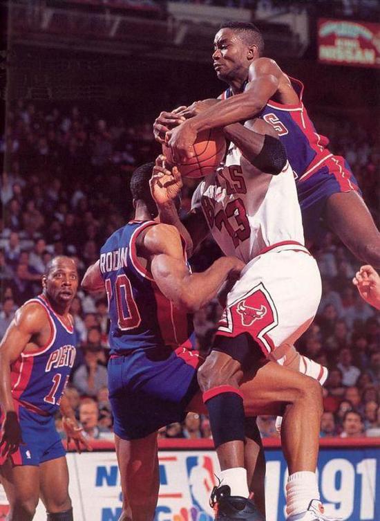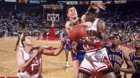 为了限制乔丹,坏小子军团可以说使出了十八般武艺,拉、拽、扯、踢、捶、肘等粗野动作全部用在了乔丹身上,在那个没有恶意犯规的年代,他们那肮脏至极的动作没有收到任何惩罚,乔丹虽然被誉为篮球之神,但他终究还是个人,哪能经受得住这般蹂躏,他也经常被打到满地打滚,但是他从未退却过,哪怕前有兰比尔,后有罗德曼,他也会毫不畏惧地杀到篮下,连续三年被活塞淘汰他也没有想过去和巴克利、大梦抱团或者加入活塞,而是继续留在公牛,他也终于在91年迈过活塞这座大山,并就此开启了封神之路。