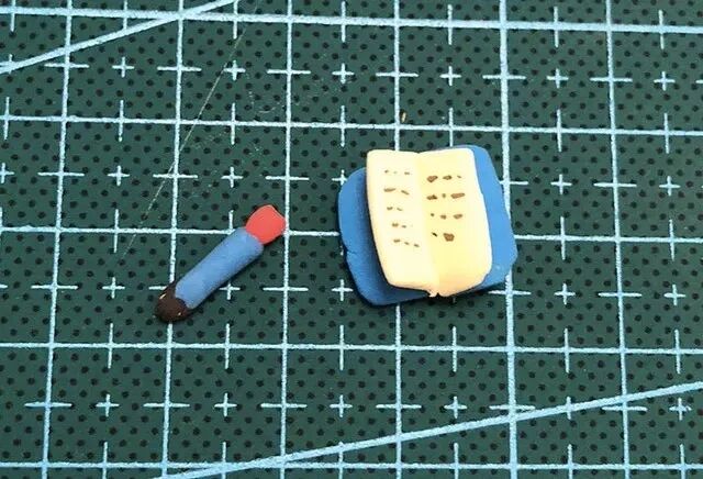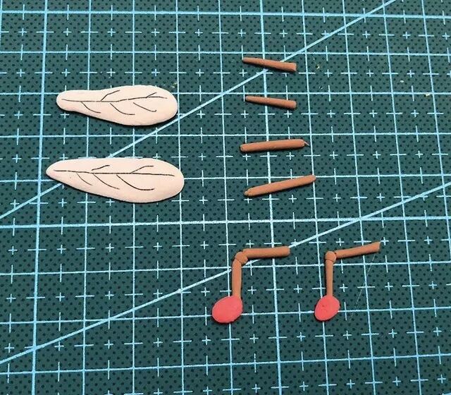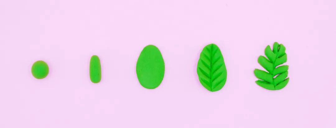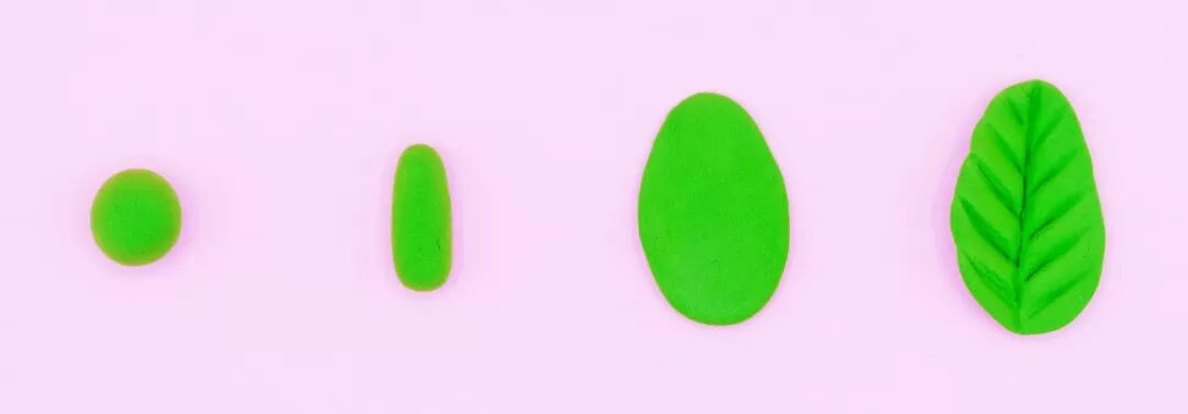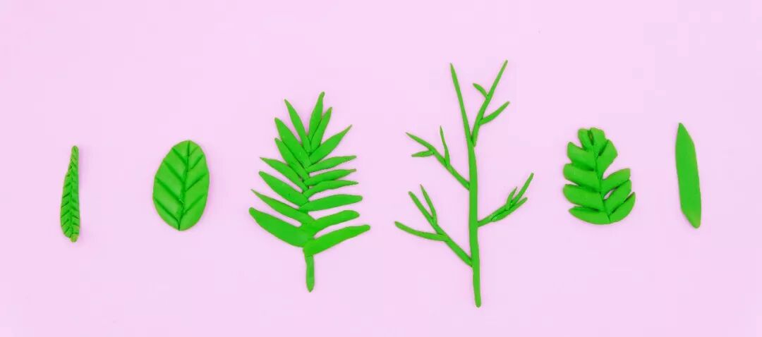 把小块的绿色粘土先揉成小球,再搓成圆柱形,压扁,用粘土工具压出叶脉,一片小树叶就完成啦!
